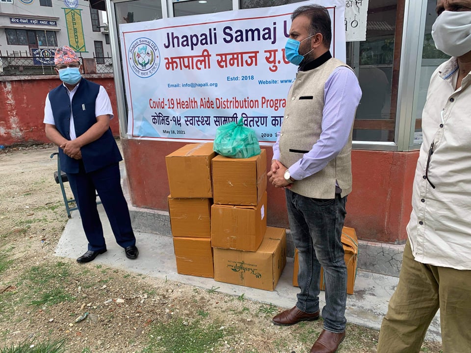 झापाली समाज युएसएले पोर्टेबल अक्सिजन क्यान १०० थान, अक्सिमिटर-४८ थान, पिपिइ- १५ थान, सेनिटाइजर ६ ग्यालन लगायतका सामग्रीहरु जेठ ४ गते हस्तान्तरण गरिएको हो ।