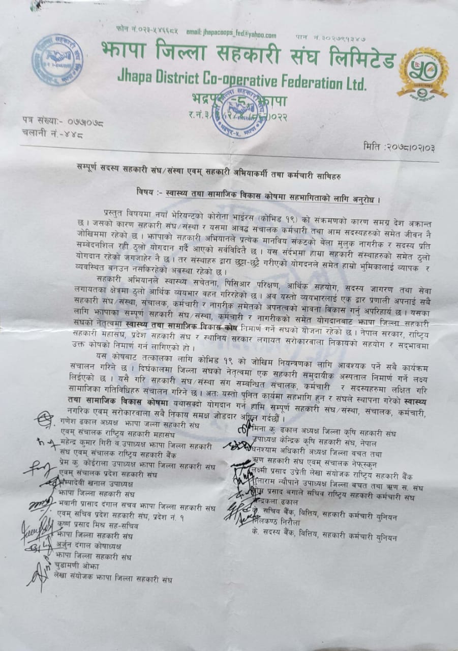 झापा, नयाँ भेरियन्टको कोरोना भाइरस (कोभिड– १९) को संक्रमण बढीरहेका बेला जिल्ला सहकारी संघ झापाले परोपकारी कार्य शुरु गरेको छ ।