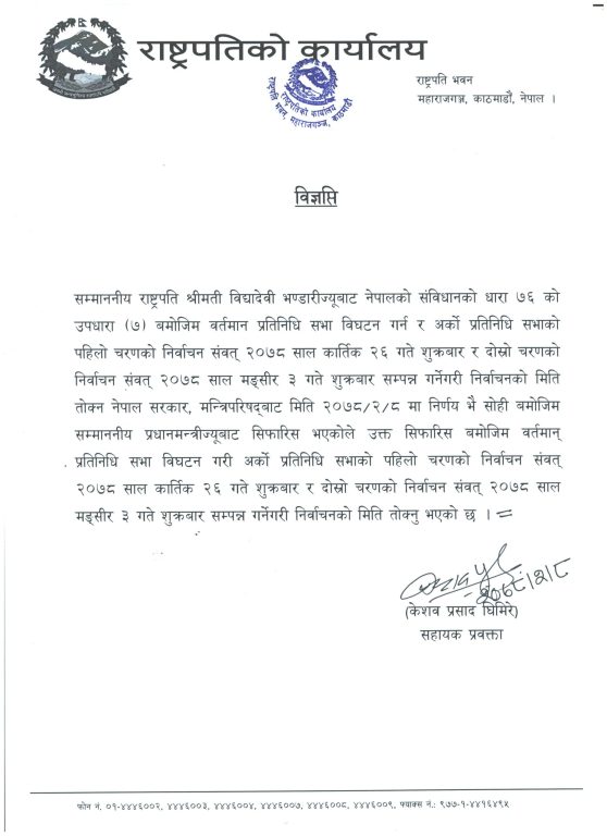 संविधानको धारा ७६–७ बमोजिम प्रतिनिधिसभा विघटन गरी अर्को प्रतिनिधिसभाको पहिलो चरणको निर्वाचन २०७८ कात्तिक २६ गते शुक्रबार र दोस्रो चरणको निर्वाचन मंसीर ३ गते शुक्रबार सम्पन्न हुने गरी मिति तोक्न मन्त्रिपरिषदबाट निर्णय भई सिफारिस गरिएको राष्ट्रपति कार्यालयको विज्ञप्तिमा उल्लेख छ ।