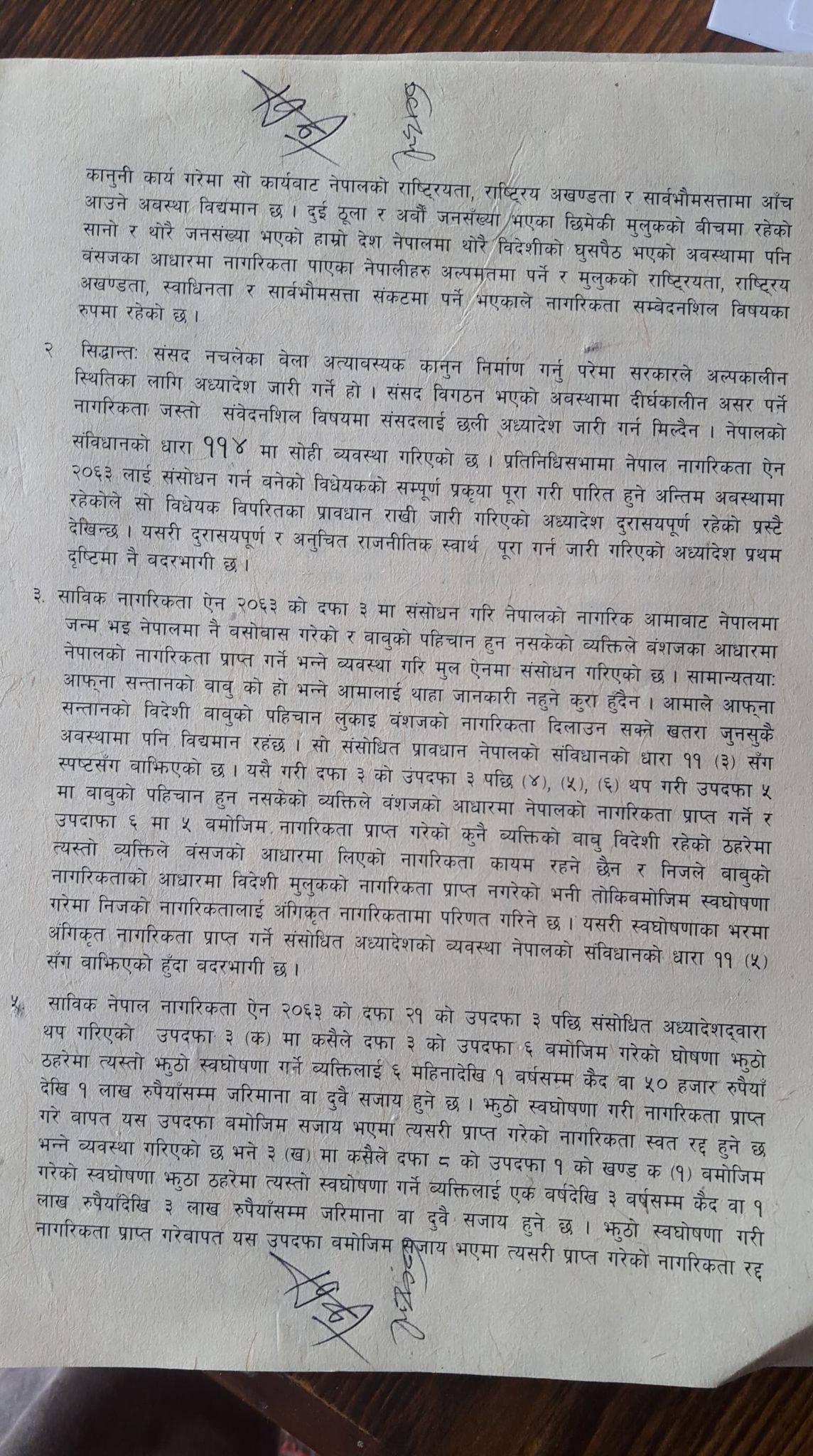 सिद्धान्तः संसद नचलेका बेला अत्याबस्यक कानुन निर्माण गर्नु परेमा सरकारले अल्पकालीन स्थितिका लागि अध्यादेश जारी गर्ने हो । संसद विगठन भएको अबस्थामा दीर्घकालीन असर पर्ने नागरिकता जस्तो संवेदनशिल विषयमा संसदलाई छली अध्यादेश जारी गर्न मिल्दैन । प्रतिनिधिसभामा नेपाल नागरिकता ऐन २०६३ लाई संसोधन गर्न बनेको विधेयकको सम्पूर्ण प्रकृया पूरा गरी पारित हुने अन्तिम अबस्थामा रहेकोेले सो विधेयक विपरितका प्रावधान राखी जारी गरिएको अध्यादेश दुरासयपूर्ण रहेको प्रस्टै देखिन्छ । यसरी दुरासयपूर्ण र अनुचित राजनीतिक स्वार्थ पूरा गर्न जारी गरिएको अध्यादेश प्रथम दृष्टिमा नै बदरभागी रहेको रिटमा जिकिर छ ।