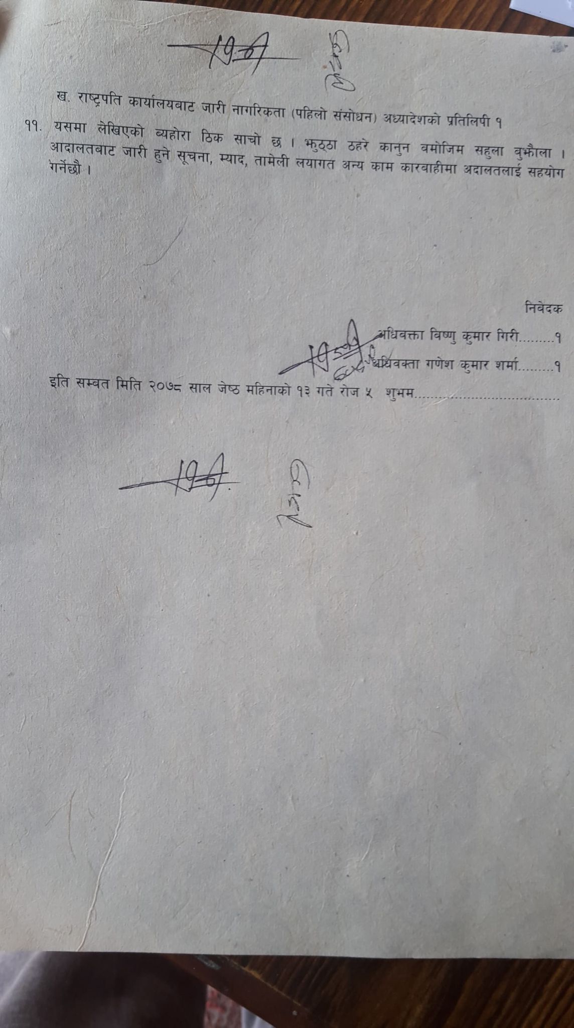 संसदको राज्य व्यवस्था समितिबाट पारित भएर नागरिकता ऐन २०६३ लाई संसोधन गर्न बनेको विधेयक प्रतिनिधिसभामा पारित हुने अन्तिम अबस्थामा रहेका बेला सरकारले आफूखुशी संसोधन गरेर प्रतिनिधिसभा विघटन गरेको मौकाछोपी अध्यादेशका रुपमा जारी गरेपछि अधिवक्ता द्वयले उक्त अध्यादेश खारेजीको माग गरेका हुन् ।