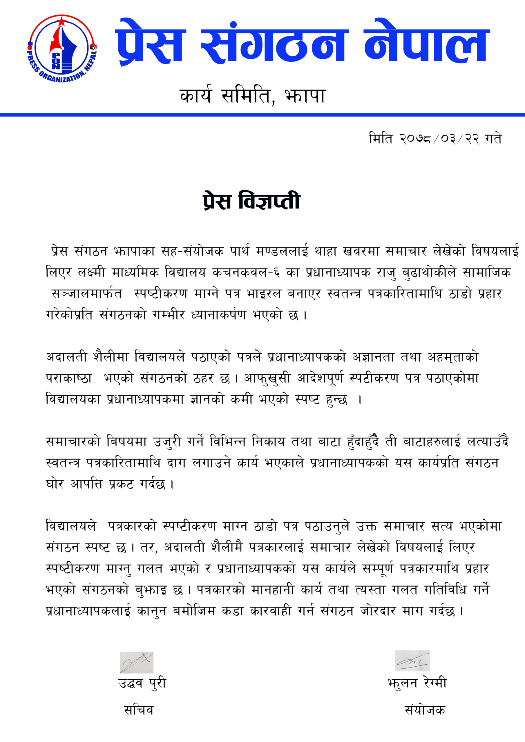 अदालती शैलीमा विद्यालयले पठाएको पत्रले प्रधानाध्यापकको अज्ञानता तथा अहम्ताको पराकाष्ठा भएको संगठनले ठहर गरेको छ । पत्रकारको मानहानी तथा त्यस्ता गलत गतिविधि गर्ने प्रधानाध्यापकलाई कानुन बमोजिम कडा कारवाही गर्न प्रेस संगठनले पनि माग गरेको छ ।