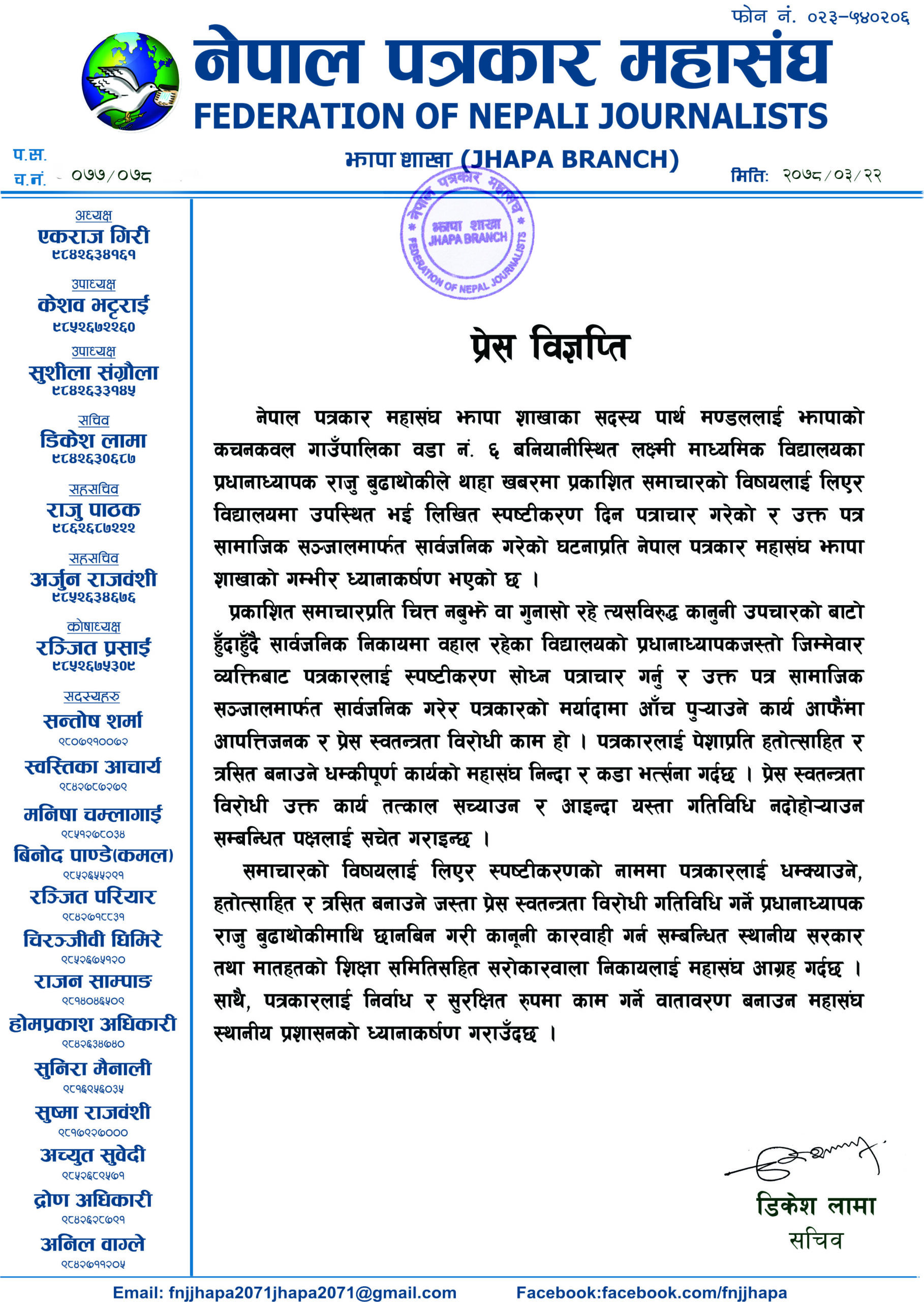 कचनकवल गाउँपालिका–६ बनियानीस्थित लक्ष्मी माध्यमिक विद्यालयका प्रधानाध्यापक राजु बुढाथोकीले थाहा खबरमा प्रकाशित समाचारको विषयलाई लिएर विद्यालयमा उपस्थित भई लिखित स्पष्टीकरण दिन पत्रकार मण्डललाई पत्राचार गरेको र उक्त पत्र सामाजिक सञ्जालमार्फत सार्वजनिक गरेको घटनाप्रति नेपाल पत्रकार महासंघ झापा शाखाले गम्भीर ध्यानाकर्षण भएको जनाएको छ ।