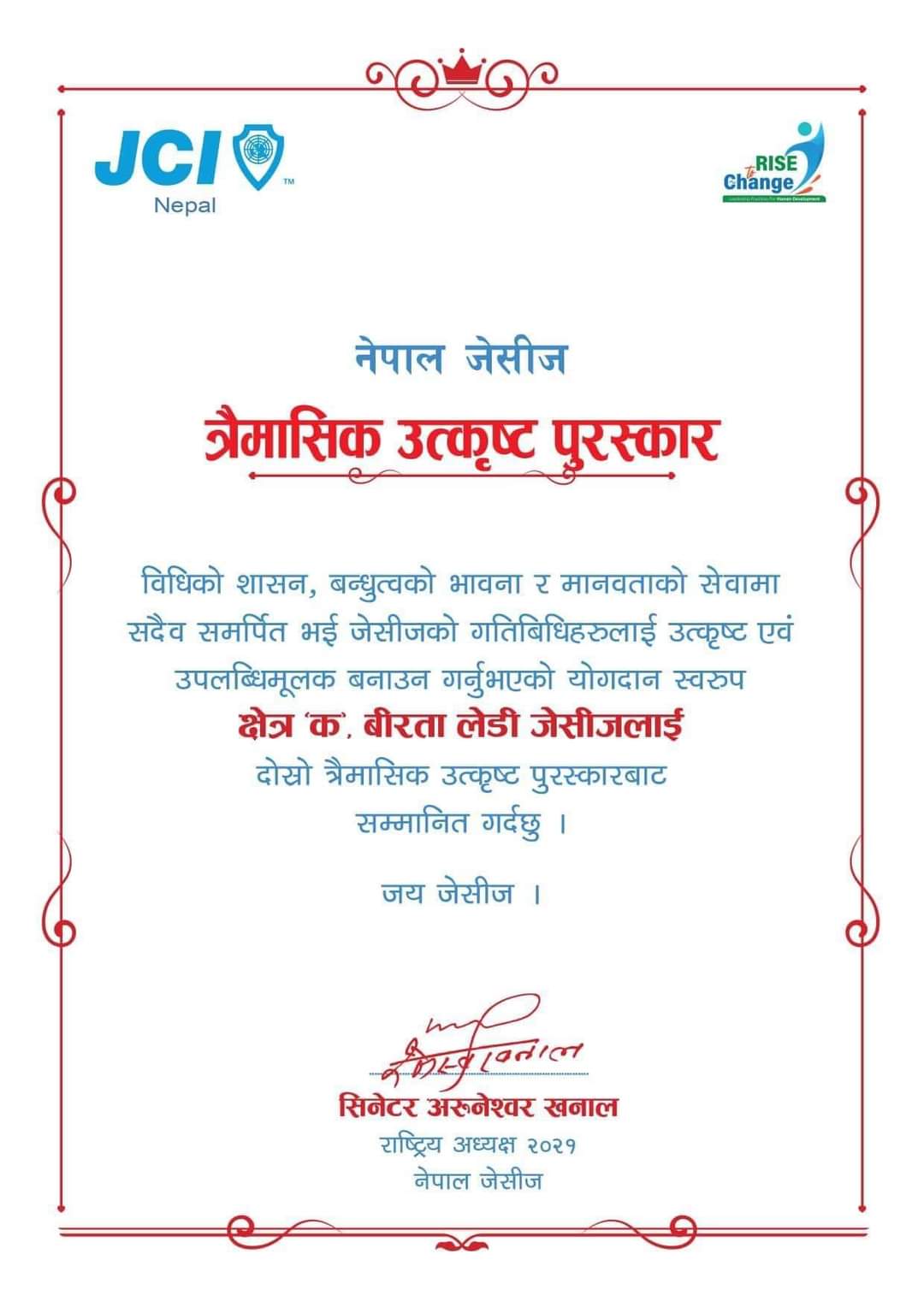 बिर्तामोडस्थित वीरता लेडी जेसीजलाई नेपाल जेसीजले उत्कृष्ट पुरस्कार प्रदान गरेको छ ।