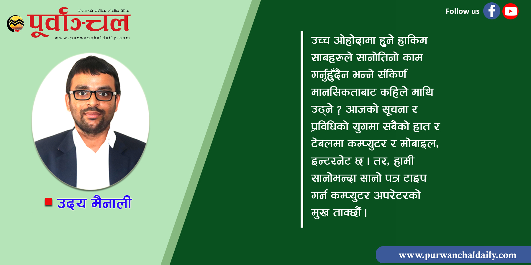 उच्च ओहोदामा हुने हाकिम साबहरुले सानोतिनो काम गर्नुहुँदैन भन्ने संकिर्ण मानसिकताबाट कहिले माथि उठ्ने ? आजको सूचना र प्रविधिको युगमा सबैको हात र टेबलमा कम्प्युटर र मोबाइल, इन्टरनेट छ । तर, हामी सानोभन्दा सानो पत्र टाइप गर्न कम्प्युटर अपरेटरको मुख ताक्छौं । विभिन्न संघ–संस्थामा कार्यरत हामी सकेसम्म आफ्नो भागको काम अरुलाई पन्छाउनतिर लागेका छौं । कसैबाट कामको सिलसलामा गल्ती भयो भने गल्ति महशुस गरेर सुधार्ने तर्फभन्दा कसरी आफूभन्दा सानो तहको व्यक्तिमा गल्ति थोपरौं भन्ने ध्येय लिएर बसेका छौं । त्यसैले हामीले माथिका सबै गलत परिपाटीको अन्त्य गर्दै एउटा कुशल र विकासप्रेमी सोचको मार्ग प्रशस्त गर्नु नै पर्छ ।