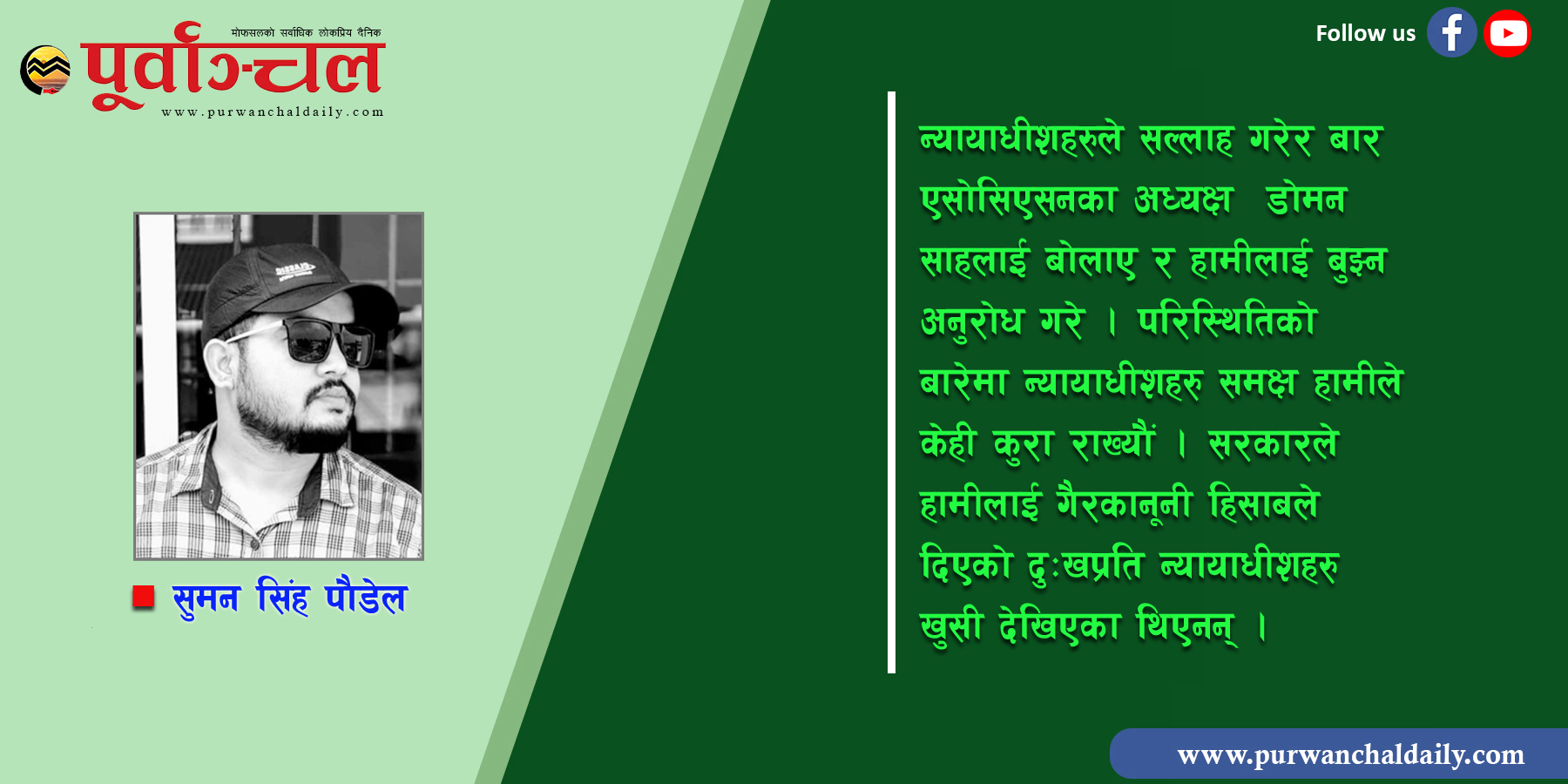 मान्छे बुझाएको भर्पाइ लिनु भयो भाइ ? प्रहरीलाई एक न्यायाधीशले प्रश्न गरे । अँ लियौ श्रीमान –प्रहरीले जवाफ दिए । बाहिर दुईवटा प्रहरी भेन तैनाथ देखिन्थे । जासुसहरुको चहलपहल पनि थियो । हामीलाई कानून ्रव्यवसायीको जिम्मामा छोड्ने सम्बन्धी कागजी प्रक्रिया पूरा भएको थियो । न्यायाधीशहरुले हामीलाई ल जानुस् तपाईंहरु डोमनजीले तपाईंहरुलाई बाहिर निकाल्नुहुन्छ भनेर बिदा दिए । हामी अदालतको पछाडिको ढोकाबाट झट्पट बाहिर निस्कियौं । तर, स्थिती त्यति सहज थिएन । अलि पर डोमनजीको कार्यालय थियो एकछिन त्यहाँ रोकियौं । डोमनजीले पत्रकार बोलाउनु भएको रहेछ । उहाँ बुझ्न भनेर बाहिरिनु भयो । कान्तिपुरका पत्रकार साथीहरु आएर हाम्रो फोटो लिए साथै केही प्रश्न गरे । कहिलै अनुभव नभएको तराई, कोरोनाको महामारीले आक्रान्त जनता, प्रहरीको तीव्र खोजी र हाम्रो भाग्दै गरेको अवस्था निक्कै कठिन थियो ।