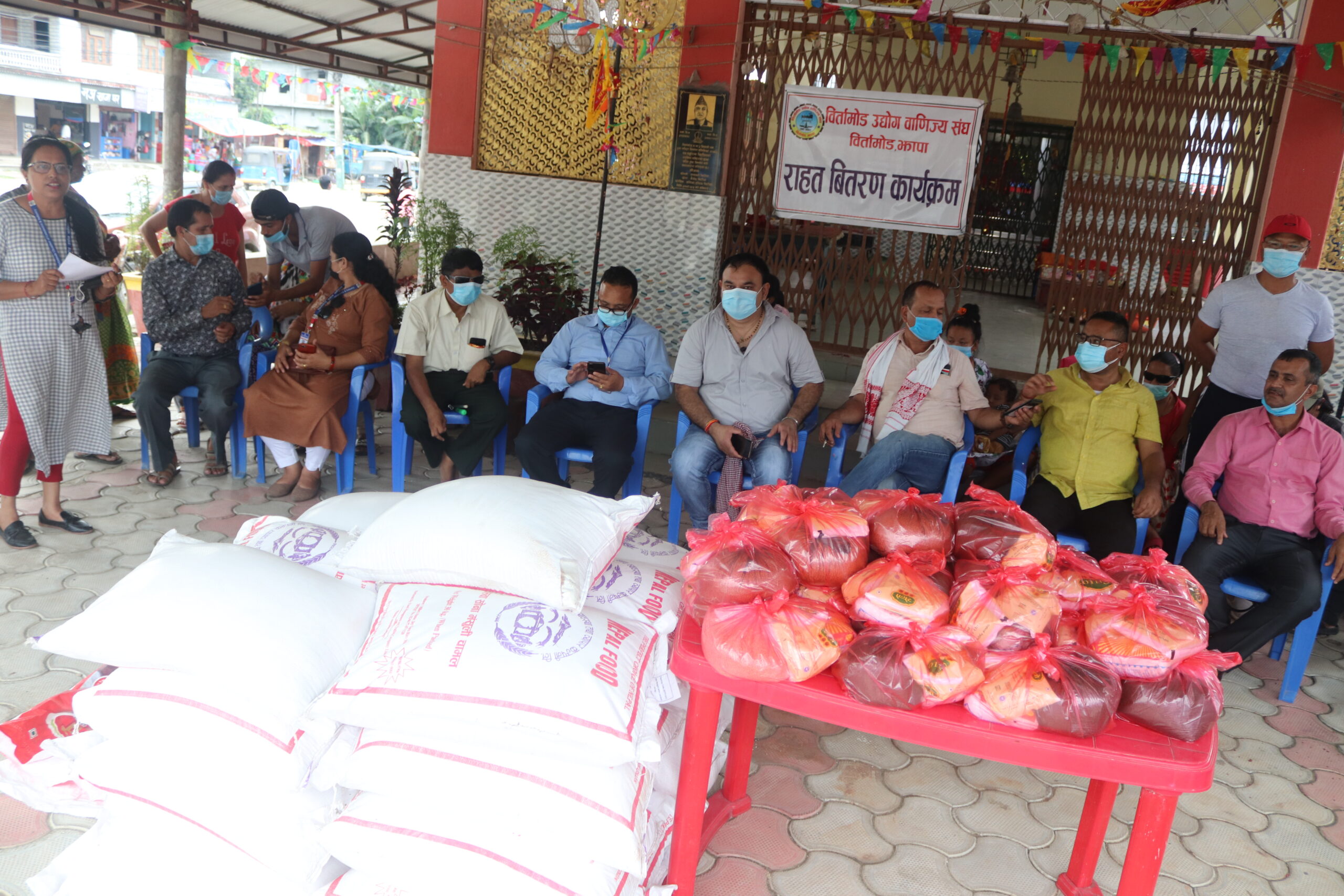 वाणिज्य संंघका निर्वमान अध्यक्ष कुमार भट्टराईले संवाद समूहले आयोजना गरेको कार्यक्रममा झापाका शारीरिक अपाङ्गता भएका ब्यक्तिहरु समस्यामा परेको बताएपछि विभिन्न संघ, संस्थाहरुले हरेक वडामा गएर राहत वितरण गरिरहेको र बिर्तामोडका १० वटै वडामा राहत वितरण गरिने जानकारी दिए ।