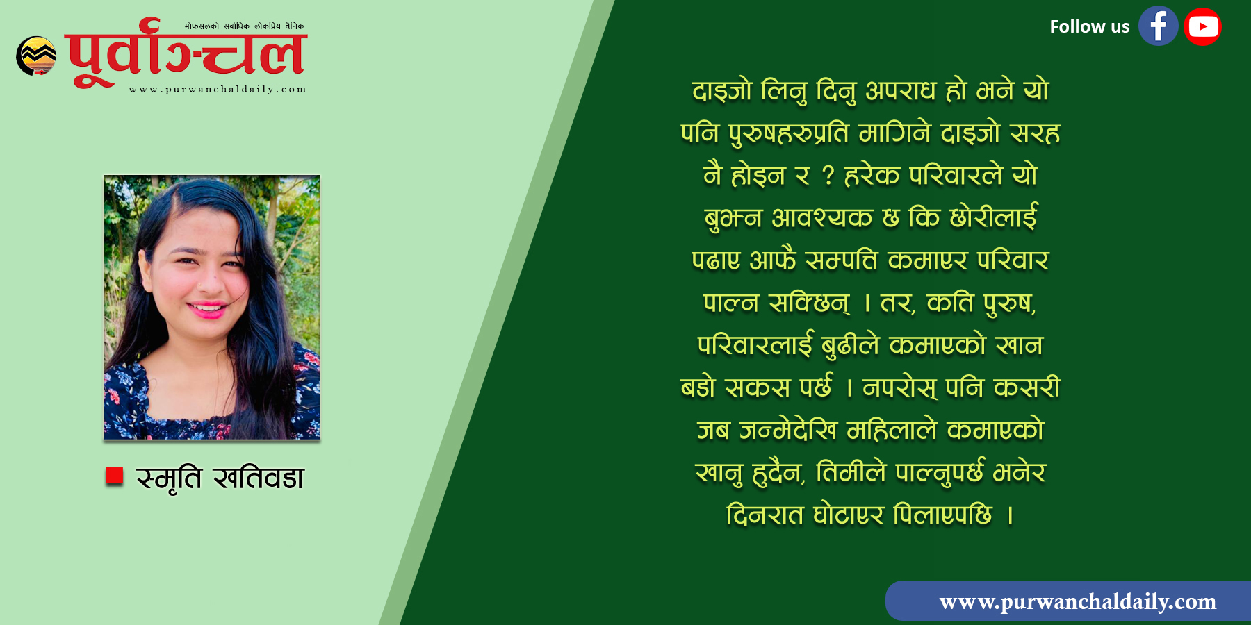 अझ कति विवाहित पुरुष घर फर्कदा श्रीमती अरु कसैको अंगालोमा हुन्छिन् अनि समाज त्यतिबेला चाहिँ मौन बसिदिन्छ । सायद महिला थिइन् भने सहानुभूति दिनेको ओइरो लाग्थ्यो तर पुरुष भएकोले टुलुटुलु हेरिरहन्छ किनकि समाजले ‘चित्त जतिनै दुखे पनि, चोट, पीडा लागे पनि तिमी रुनु हुँदैन, हिम्मत हार्नु हुँदैन’ भनेर रटाएको छ । विवाह गर्दा केटीमा संस्कार, सभ्यता र समय अनुसारको पढाई–लेखाई हेरिन्छ भने पुरुषहरुमा पढाइ–लेखाइ, जग्गाजमिन, धन, सम्पत्ति, वैदेशिक रोजगार, पेसा, जागिर सबै केलीकुलाई हेरिन्छ । अर्काको परिवारमा छोरी दिँदा सबै बुझ्नु अनुचित हैन तर केटा ३६ लक्षणले युक्त भएकै चाहिने, आफूभन्दा धनाढ्य हुनुपर्छ भन्ने मनस्थिति एकदमै गलत हो । कसैको रुप, रङ्ग, सम्पत्ति, घर, ठाउँकै कारण निर्थुक्क परेर अस्वीकृत हुँदै आफ्ना अपूर्णताको बखान सुनिरहँदा कति मानसिक असर पर्दो हो । दाइजो लिनु दिनु अपराध हो भने यो पनि पुरुषहरुप्रति मागिने दाइजो सरह नै हैन र ? हरेक परिवारले यो बुझ्न आवश्यक छ कि छोरीलाई पढाए आफै सम्पत्ति कमाएर परिवार पाल्न सक्छिन् । तर कति पुरुष, परिवारलाई बुढीले कमाएको खान बडो सकस पर्छ । नपरोस् पनि कसरी जब जन्मेदेखि महिलाले कमाएको खानु हुँदैन, तिमीले पाल्नुपर्छ भनेर दिनरात घोटाएर पिलाएपछि । छर–छिमेक र इष्टमित्रमा नामर्द र जोइटिङ्ग्रे भन्दै खिसी गर्नेको कमी हुँदैन । एउटी बलत्कृत स्त्रीलाई कति पुरुषहरुले सहजै स्वीकार्न सके पनि परिवार, नातागोता र समाजको चाँपले त्यो पुरुषलाई खर्लप्पै खाउँ जसो गर्ने व्यवहारले दिँदैन ।