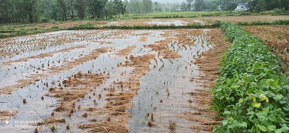 झापाको शिवसताक्षीमाका स्थानीय सीता गुरुङ्गको करिव एक विगाहमा लगाएको धानको पाँजा पानीमा डुबेको छ । धानको पाँजा उठाएर कुन्यू लगाउँने दिन नै पानी परेकाले पाँजा लगाएको धान खेतमै डुबेको बताउनु भयो ।