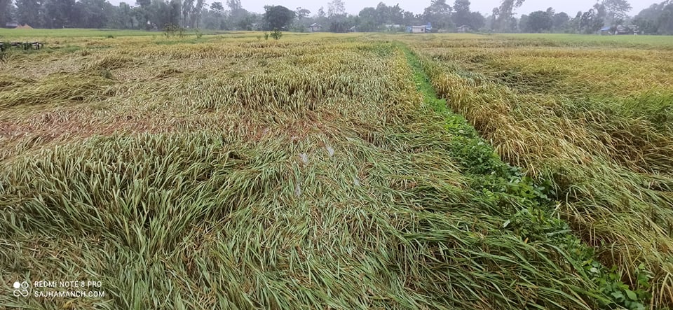 यतिबेला किसानले धान काटर पाँजा लगाएका थिए । कतिपय किसानले पाँजा लगाएको धान उठाउन तमतयार थिए । काट्न आँटेको धान समेत हावा सहित परेको वर्षका कारण ढलेर सोत्तर भएको छ ।