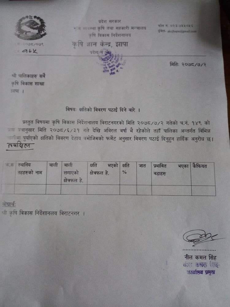 पाकेर बाली उठाउने बेलाको धानमा बर्षातको पानी पसेर केही ठाउँमा धानीबाली पूर्ण रुपमा नष्ट भएको छ भने केही ठाउँमा भने हावा पानीका कारण धानबाली डुबानमा परेको छ । अहिले कृषि ज्ञान केन्द्रले जिल्लाका १५ वटै पालिकामा क्षतिको विवरण संकलन शुरु गरेको कृषि ज्ञान केन्द्र झापाका प्रमुख नील कमल सिंहले बताउनुभयो । –––