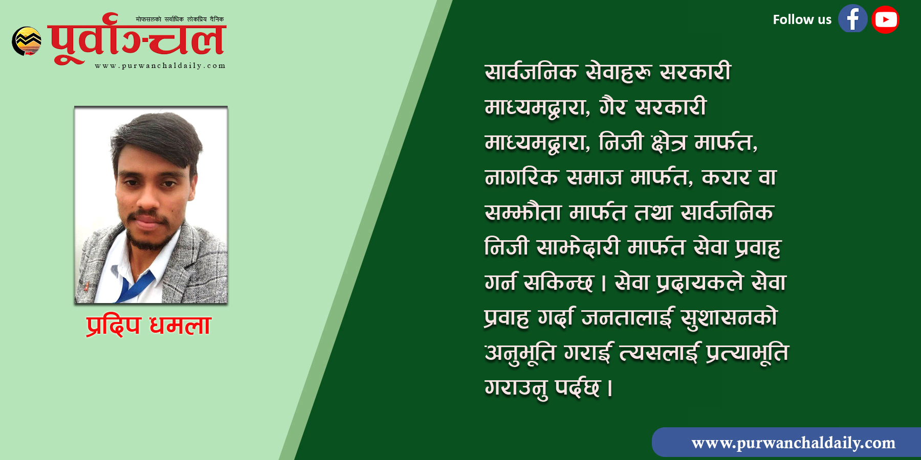हाल नेपालमा तीन तहका सरकार रहेका छन् । देशमा संघीयतासहितको लोकतान्त्रिक गणतन्त्रात्मक मुलुक स्थापित भएको छ । जनताले सेवा लिन जिल्ला सदरमुकाम जानुपर्ने हैरानी हटेर गएको छ । आफ्नै स्थानीय ठाउँमा हाम्रो आफ्नो स्थानीय सरकार रहेको छ । ती तीनै तहका सरकारले आफ्नो सेवाप्रवाहको माध्यमबाट जनतालाई खुशी बनाउन सक्दछन् भने जनतालाई पनि आफ्नै गाउँ–ठाउँमा सरकार आएको अनुभूति हुनेछ । सेवाप्रवाह एउटा उस्तो कडी हो जो सरकारको उपलब्धि गराउन सक्दछ । नीति–निर्माण भएपछि त्यसको सही कार्यान्वयन गर्न सेवाप्रवाह नै अपरिहार्य हो । जनता आश्वासनभन्दा पनि काम हेर्न चाहन्छन् । जनतालाई तोकिएको समयभित्र छिटो–छरितो गरी सेवा प्रवाह गर्न सकेका सम्पूर्ण देश तथा कर्मचारीको पनि सबल पक्ष झल्किन सक्छ ।