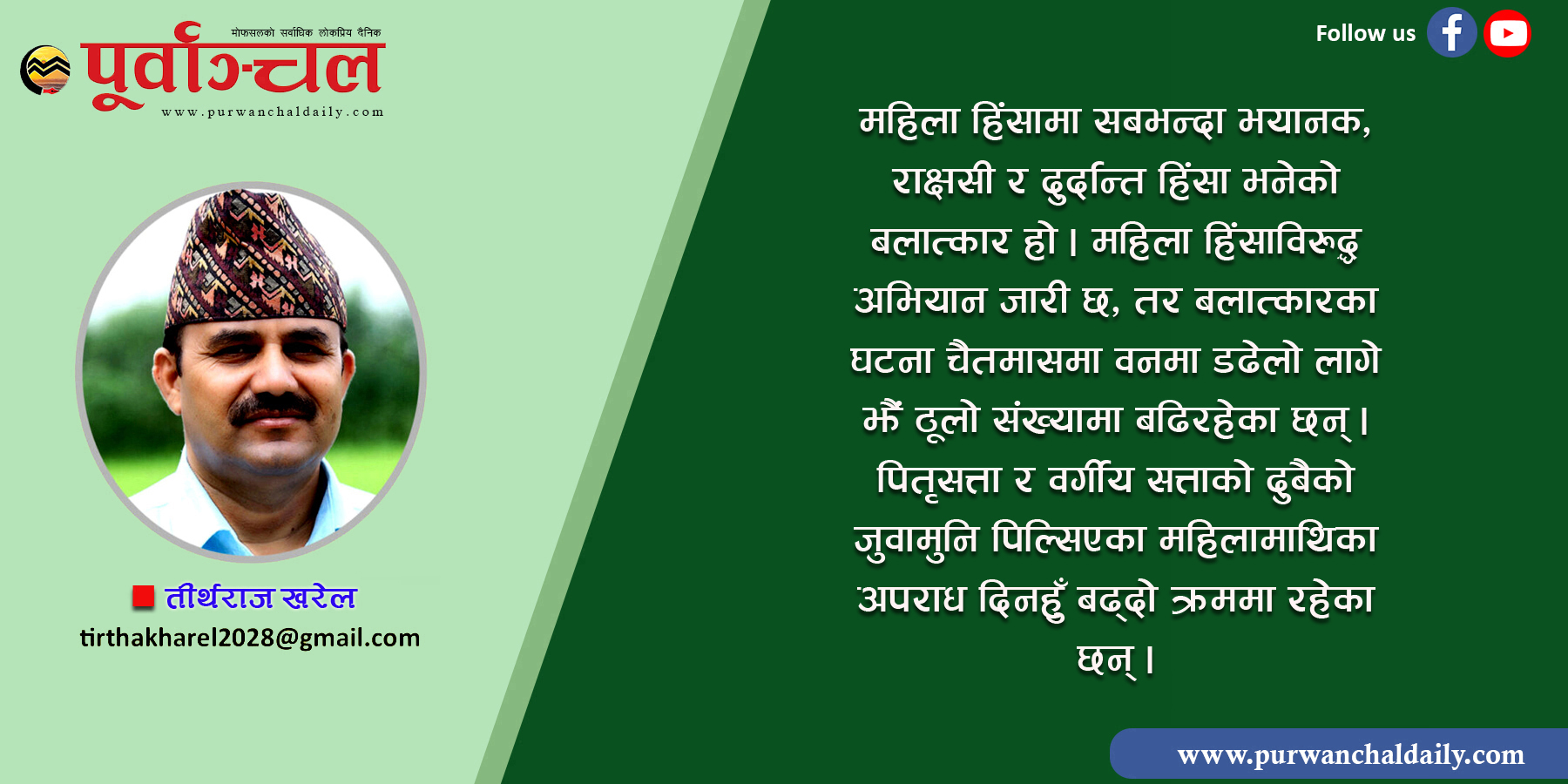 विज्ञान प्रविधिको उच्चतम विकास भइरहेको सभ्य भनिएको आजको आधुनिक युगमा मानिस नृशंस राक्षस जस्तो बनिरहेको छ । यो राज्यव्यवस्था र मानवीय प्रवृत्ति दुबैको दोष हो । साक्षरता दर बढेर माथि पुगिसकेको छ । विश्वविद्यालयका डिग्रीधारीहरुको संख्या पनि वृद्धि भइरहेको छ । चेतनशील र शिक्षित मानिसको संख्याको आधारमा आनुपातिक रुपमा बलात्कार जस्तो अपराधमा कमी आउनुपर्ने हो, तर स्थिति निराशाजनक छ । विभिन्न अध्ययनहरु अनुसार संसारभरिका प्रत्येक तीन मध्ये एक महिलाले आफ्नो जीवनकालमा कुनै न कुनै प्रकारको हिंसा भोगेका हुन्छन् र धेरैजसो हिंसा भने उनीहरुका निकट, प्रेमी, विश्वासपात्र या जीवनसाथीबाट भोगेका हुन्छन् भन्ने जनाइएको छ । विपरीत लिङ्गीप्रति आकर्षित हुनु स्वभाविक हो, तर आकर्षणको अर्थ हिंसा होइन । यतिबेला शरीर होइन मन जित्नसक्ने पुस्ताको खाँचो छ, नयाँ पुस्तामा लैङ्गिक समानताका धारणाहरुको बीजारोपण गर्न जरुरी छ । आज असल मानव निर्माण गर्ने शिक्षाको जरुरत छ ।