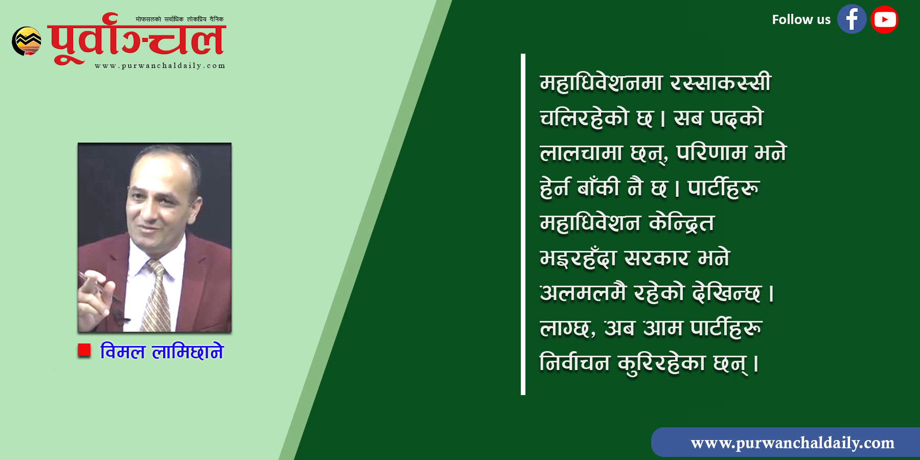त्यस्तै राष्ट्रिय प्रजातन्त्र पार्टी (राप्रपा)को पनि महाधिवेशन सम्पन्न भएको छ । जसमा पुराना अध्यक्ष कमल थापा पाखा लागेका छन् भने नयाँ अध्यक्षमा राजेन्द्र लिङ्देनको उदय भएको छ, जसले राजनीतिक वृत्तमा एक प्रकारको तरंग फैलिएको छ । लामो समय राप्रपाको अध्यक्षता गर्दै आएका कमल थापाको विरासत भत्किएको छ । त्यस्तै नेपाली कांग्रेसको महाधिवेशन पनि संघारमै आइसकेको छ । महाधिवेशनमा रस्साकस्सी चलिरहेको छ । सब पदको लालचामा छन्, परिणाम भने हेर्न बाँकी नै छ । पार्टीहरू महाधिवेशन केन्द्रित भइरहँदा सरकार भने अलमलमै रहेको देखिन्छ । लाग्छ, अब आम पार्टीहरू निर्वाचन कुरिरहेका छन् ।