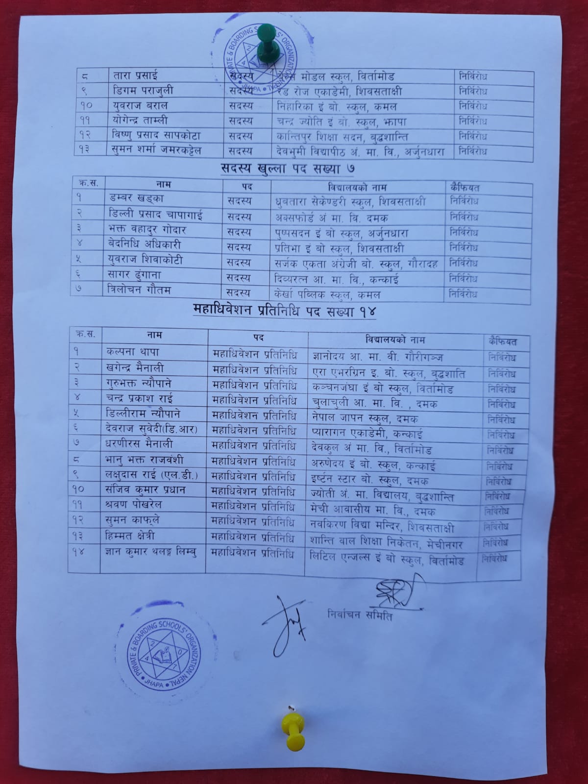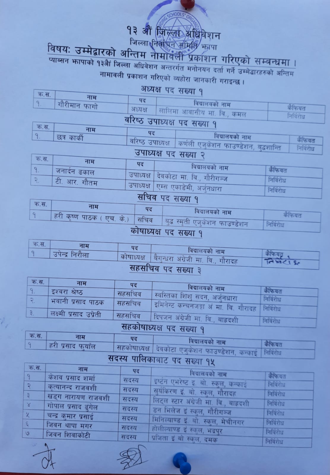 सचिवमा हरिकृष्ण पाठक, कोषाध्यक्षमा उपेन्द्र निरौला, सहसचिवमा इश्वरा श्रेष्ठ,भवानी पाठक र लक्ष्मी प्रसाद उप्रेती चयन भएका हुन् । सह कोषाध्यक्षमा हरि प्रसाद फुँयाल चयन भएका छन् ।