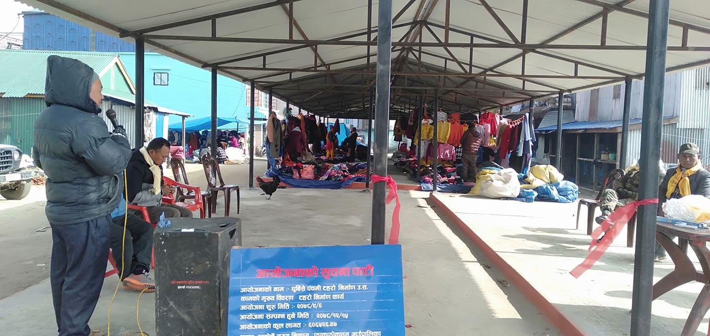 बजारको नाममा रहेको एक रोपनी जमीनमा टहरो निर्माण गर्न फाकफोकथुम गाउँपालिकाले गत आर्थिक वर्षमा उपलब्ध गराएको बजेट र उपभोक्ताबाट श्रमदान गरी जम्मा आठ लाख ७५ हजार सात सय ५१ रुपैंया लागतमा २० मिटर लामो र सात मिटर फराकिलो भूई ढलान सहित ट्रस हालिएको टहरो निर्माण भएको थियो ।