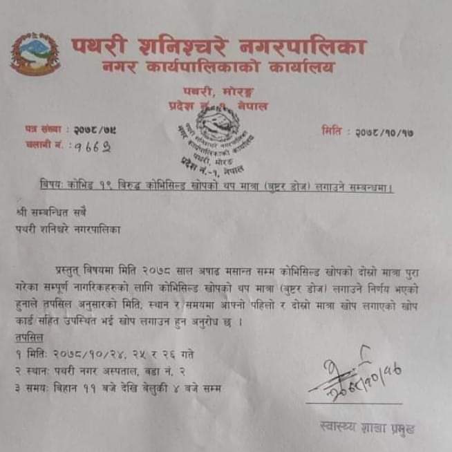 पथरीशनिश्चरे नगरक्षेत्रमा कोरोना भाईरस विरुद्ध कोभिसिल्ड खोपको दोस्रो मात्रा पूरा गरेका नागरिकलाई बुष्टर डोज लगाईने भएको छ ।