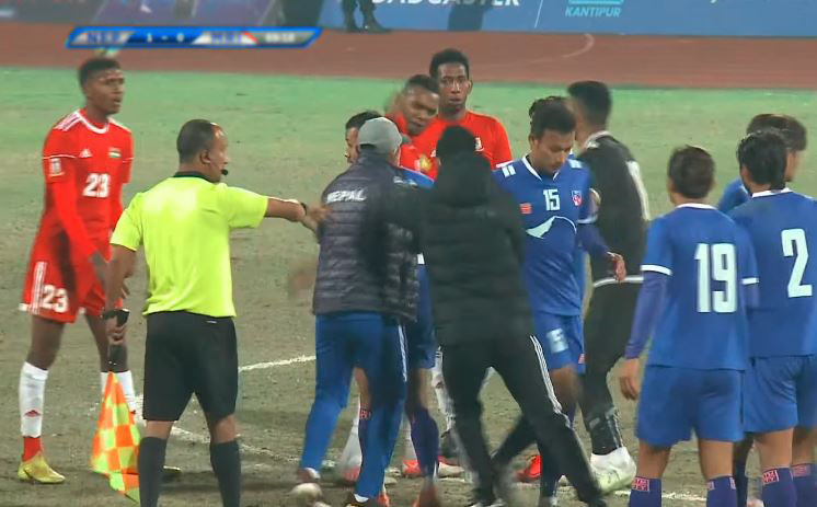 यस्तै नेपालका पुजन उपरकोटी पनि रातो कार्ड पाउँदै मैदानबाट गए । यस्तै रेफ्री नविन्द्र महर्जनले नेपालका टिम म्यानेजर मधुसदन उपाध्यायलाई पनि रातो कार्ड देखाए ।