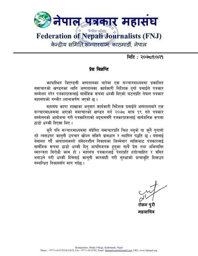 महासंघले शुक्रबार एक विज्ञप्ती जारी गर्दै भनेको–’कुनै पनि सञ्चारमाध्यममा संप्रेशित समाचार प्रति चित्तनबुझे या कुनै गुनासो रहे त्यस उपर कानुनी उपचार खोज्न सकिने प्रावधान र स्थिापित पद्धति छ । यसलाई वेवास्ता गर्दै अस्पताल जस्तो संवेदनशिल निकायका जिम्मेवार ब्यक्तिबाट पत्रकारलाई सार्वजानिक रुपमा ठाडो धम्की दिनु आपत्ति जनक हुनुका साथै प्रेस तथा अभिब्यक्ति स्वतन्त्रता विरोधी काम हो ।’