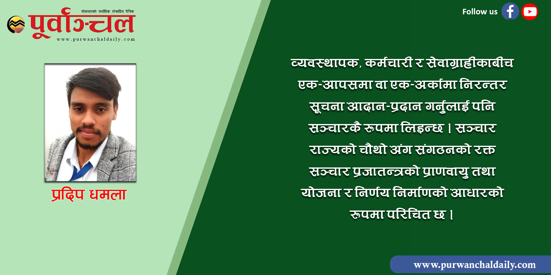 व्यवस्थापक, कर्मचारी र सेवाग्राहीकाबीच एक–आपसमा वा एक–अर्कामा निरन्तर सूचना आदान–प्रदान गर्नुलाई पनि सञ्चारकै रुपमा लिइन्छ । सञ्चार राज्यको चौथो अंग संगठनको रक्त सञ्चार प्रजातन्त्रको प्राणवायु तथा योजना र निर्णय निर्माणको आधारको रुपमा परिचित छ । हामी सूचना तथा जानकारी विभिन्न सञ्चारका तत्वहरु तथा पक्षहरुबाट प्राप्त गर्न सक्दछौं । जस्तैः प्रेषक (पठाउने व्यक्ति वा निकाय) संकेत, (सन्देशलाई बुझाउन प्रयोग गरिने शाब्दिक वा अशाब्दिक प्रतिक चिन्ह्र) सन्देश, (मूल्यसहितको तथ्य तथ्यांक वा जानकारी) सांकेतिकरण, (सूचनालाई कुनै संकेत चिन्ह्र संकेत वा स्वरुपमा ढाल्ने काम) माध्यम, (वाहक वा प्रवाहक जस्तै ध्वनी, हुलाक, टेलिफोन, इमेल, सञ्चारमाध्यम हुलाक) प्रापक, (सूचना पाउने बुझ्ने वा प्रयोग गर्ने व्यक्ति) प्रत्युत्तर, (प्राप्त सन्देशलाई प्रतिक्रिया दिने वा जवाफ फर्काउने काम) अवरोध, (समयमै नपुग्नु भाषागत समस्या हो–हल्ला फोन काटिनु नेट ढिलो चल्नु) पृष्ठपोषण, (प्रभावकारी सञ्चारको लागि निरन्तर प्रयास गर्ने कार्य) र वातावरण (पूर्वाग्रह तथा अवरोधरहित अवस्था) आदि पर्दछन् । सञ्चारको महत्व एक व्यक्तिदेखि अर्को व्यक्तिसम्म तथा एक कार्यालयबाट अर्को कार्यालयसम्म अति नै महत्वपूर्ण रहेको छ ।