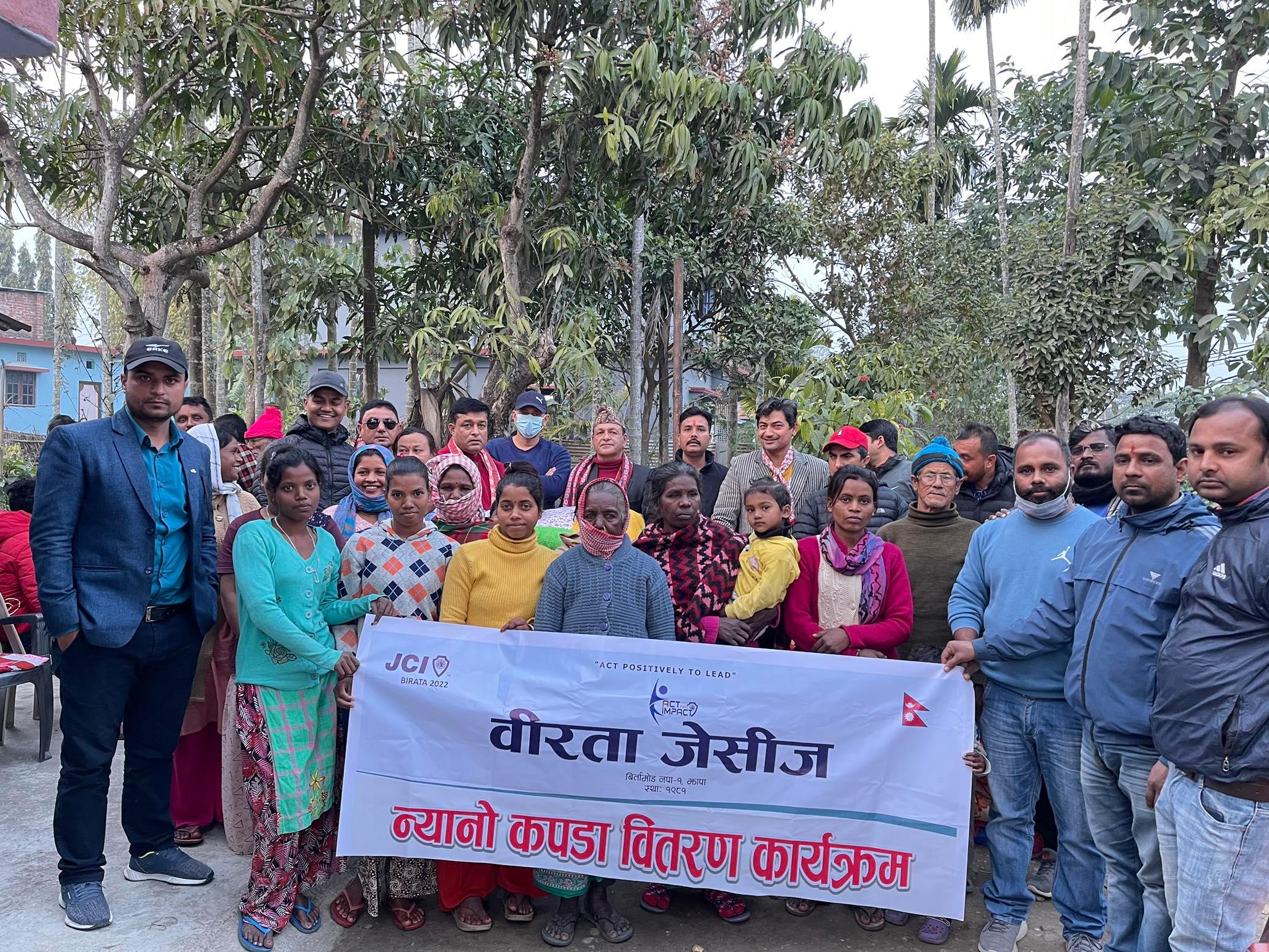 यसैबीच वीरता जेसीजले बिर्तामोड–३ विराटपोखरमा रहेका १५ विपन्न घरपरिवारका सदस्यलाई ब्याङ्केट वितरण गरेको छ । जेसी घनश्याम चौधरीको जन्मोत्सवको अवसरमा विपन्न परिवारलाई ब्याङ्केट वितरण गरिएको महासचिव खतिवडाले जानकारी दिए ।