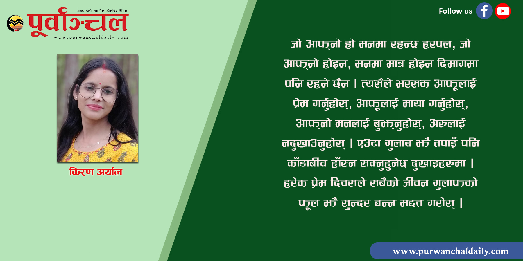जो आफ्नो हो मनमा रहन्छ हरपल, जो आफ्नो होइन, मनमा मात्र होइन दिमागमा पनि रहने छैन । त्यसैले भरसक आफूलाई प्रेम गर्नुहोस्, आफूलाई माया गर्नुहोस्, आफ्नो मनलाई बुझ्नुहोस्, अरुलाई नदुखाउनुहोस् । एउटा गुलाब झैं तपाइँ पनि काँडाबीच हाँस्न सक्नुहुनेछ दुखाइहरुमा । हरेक प्रेम दिवसले सबैको जीवन गुलाफको फूल झैं सुन्दर बन्न मद्दत गरोस् । प्रेमको उल्टो शब्द घृणा कसैको जीवनमा नआओस्, प्रेमील मनहरुमा प्रेम दिवस अर्थात् १४ फेब्रुअरीको हार्दिक शुभकामना ।