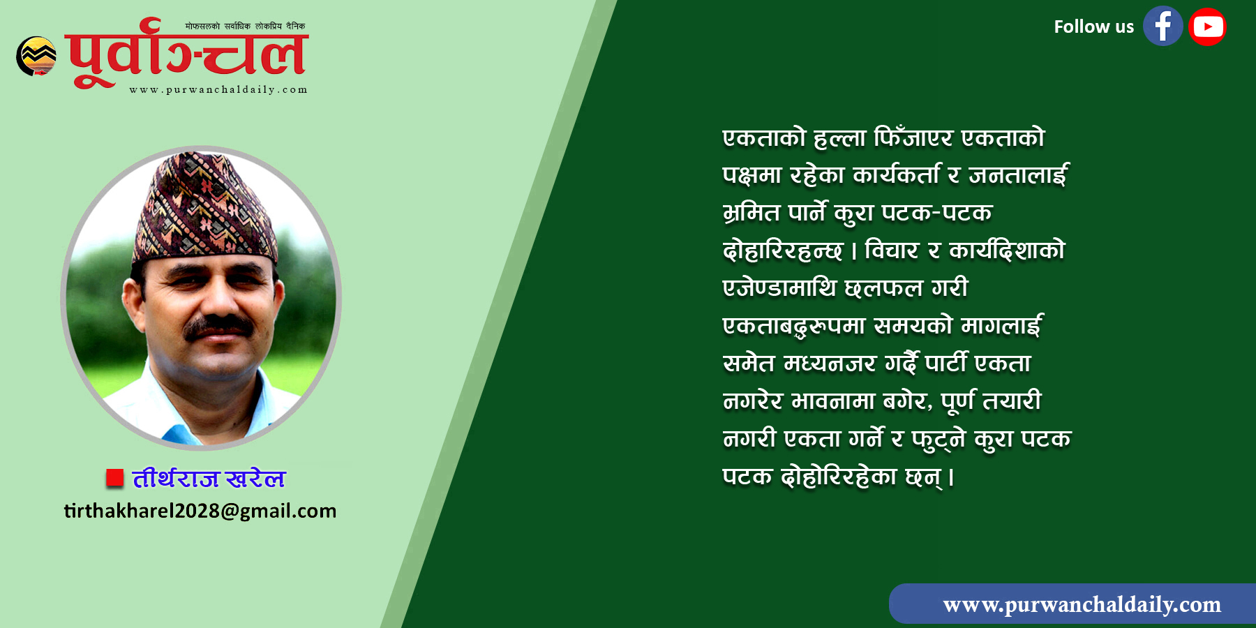 पार्र्टीभित्रका गलत संस्कार र संस्कृतिका विरुद्धमा आफ्नै टाउकोमा आगो झोस्न पुष्पकमल दाहाल तयार हुन सक्छन् भनेर पूर्णरुपमा विश्वास गर्न सकिँदैन । नेतृत्वले अवसरवाद र जनघाती बाटो त्यागेर स्वच्छ छवि र जनतामा भिजेर काम गर्न सक्नेमा आशा र विश्वास गर्न त्यति सहज छैन । यसको मूल कारण प्रचण्डलाई ‘विश्वका महान नेता’ भनेर भजनगान गर्ने र युग अनुरूप विचार सिद्धान्तको विकास गर्न मेहनत गर्नुभन्दा सम्पूर्ण जिममेवारी प्रचण्डको काँधमा हालिदिने प्रवृत्तिले माओवादी केन्द्रलाई उन्नतितर्फ र विकासतिर होइन, अवरुद्धतातर्फ धकेल्छ । नेकपा निर्माण गर्दा पनि विचार तथा सिद्धान्त मिले मात्र एकता सम्भव हुने स्पष्ट धारणा रहेकोमा छिटो–छिटो पूरा तयार नगरिकन पार्टी एकता गर्ने काम भयो र आज त्यो एकता भंग भएको छ ।