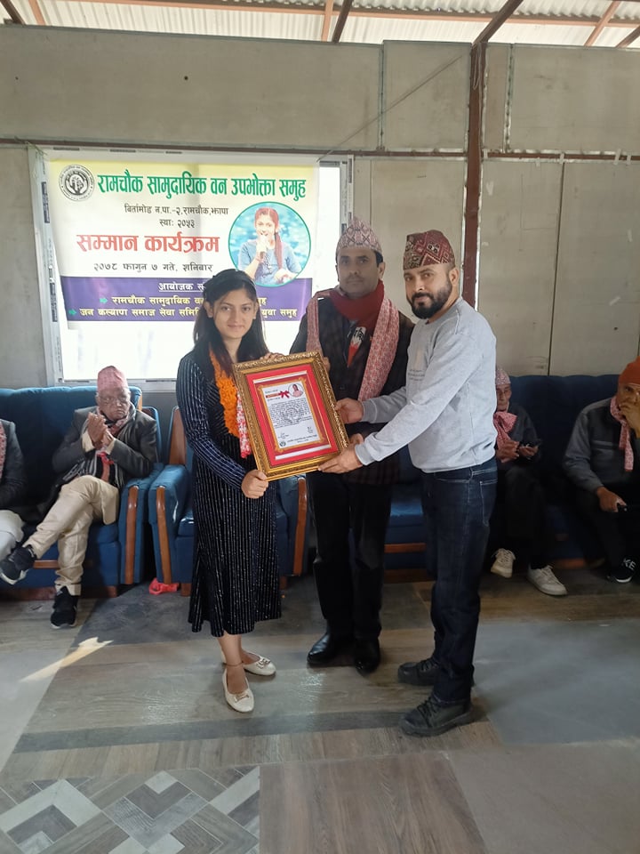 रामचोक सामुदायिक वन उपभोक्ता समुहले बाल गायन रियालिटी सो सारेगमप लिटल च्याम्प बिजेता कृपा पौडेललाई सम्मान गरेको छ ।