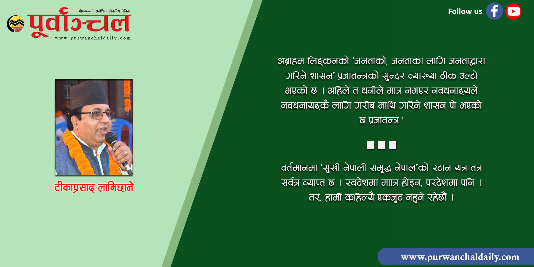 आजकल राजनीतिको रंग खुइलिँदैछ । माक्र्सवादका पखेटा रंगहीन भएर उखेलिए । उड्नै नसकेर भू–मध्य सागरमा विलय भए जस्तो छ । लेनिनवाद भोल्गा नदीबाट बग्दै क्यास्पियन र कृष्ण सागरमा हरायो । एंगेल्स र स्टालिनका भँगालाहरु सुके । हेगेल्स र प्लेटोका सिद्धान्तहरु सूचना प्रविधिको प्रयोग गर्न नजानेर अर्कै ग्रहमा बसाईं सरे सायद । अब्राहम लिङ्कनको ‘जनताको, जनताका लागि जनताद्वारा गरिने शासन’ प्रजातन्त्रको सुन्दर व्याख्या ठीक उल्टो भएको छ । अहिले त धनीले मात्र नभएर नवधनाढ्यले नवधनायढ्कै लागि गरीब माथि गरिने शासन पो भएको छ प्रजातन्त्र !