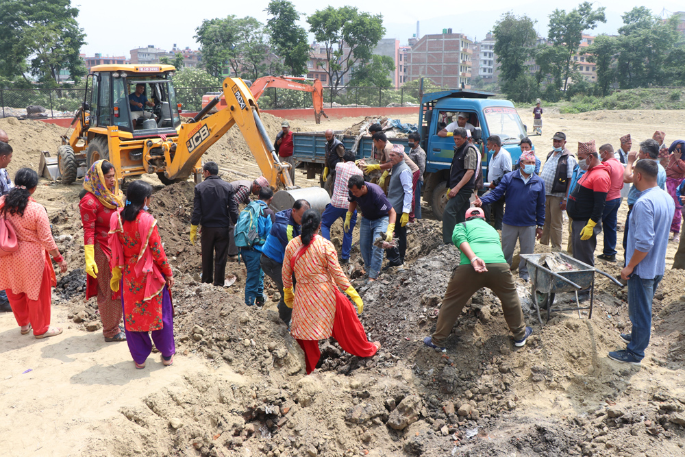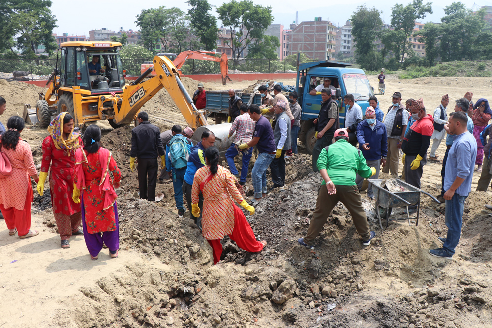 भक्तपुर नगरपालिकाले बिभिन्न ठाउँबाट ल्याएर थुपारेको फोहोर माटोलाई डोजरले खनेर पुरिएका करिब १० ट्रक ढुङ्गा, इँटा, सिसा, बोरा, फलामका तार, सिमेन्टका पिलरलगायतका सामानहरुलाई निकालेर अन्यत्र लगेर व्यबस्थापन गरिएको छ ।