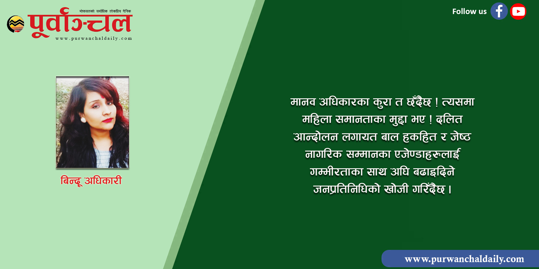 सबै जनताको प्रतिनिधित्वको लागि जनप्रतिनिधि छान्ने र स्थानीय निकाय सम्हाल्नको लागि स्थानिय सरकारको गठन गर्ने अवसर ५ बर्ष पश्चात् एकपटक प्राप्त हुँदैछ । अबको ५ बर्षको लागि हरेक नागरिकको सुरक्षा, अधिकार, न्याय र हकहितका सपनाहरु यिनै स्थानीय सरकारका प्रतिनिधिको हातमा सुम्पनु पर्दैछ । देशमा बिकास, समृद्धि, शान्ति, स्वतन्त्रता, सामाजिक क्रान्ति र विधिको शासन लागू गराउने दायित्व नयाँ पुस्तामा हस्तान्तरण हँुदैछ । मानव अधिकारका कुरा त छँदैछ ! त्यसमा महिला समानताका मुद्दा भए ! दलित आन्दोलन लगायत बाल हकहित र जेष्ठ नागरिक सम्मानका एजेण्डाहरुलाई गम्भीरताका साथ अघि बढाइदिने जनप्रतिनिधिको खोजी गरिँदैछ ।