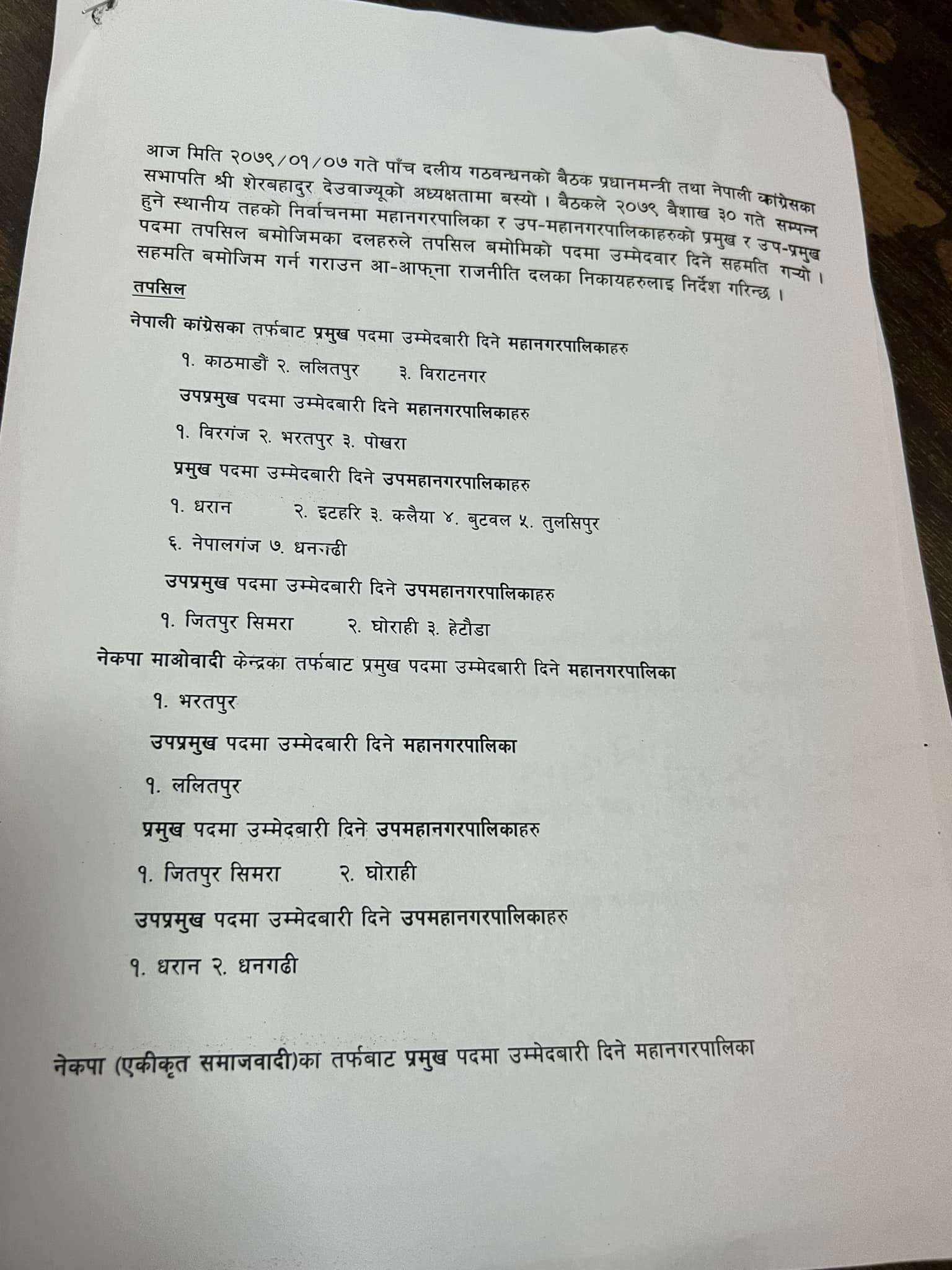 सहमति अनुसार कांग्रेसले ३ महानगर र ७ उपमहानगरपालिकाको नेतृत्व पाएकाे छ। कांग्रेसले काठमाडौं, ललितपुर र विराटनगर महानगरकाे नेतृत्व पाएकाे छ । भने, धरान, इटहरी, कलैया, बुटवल, तुलसीपुर, नेपालगञ्ज र धनगढी उपमहानगको मेयर पाएको छ।