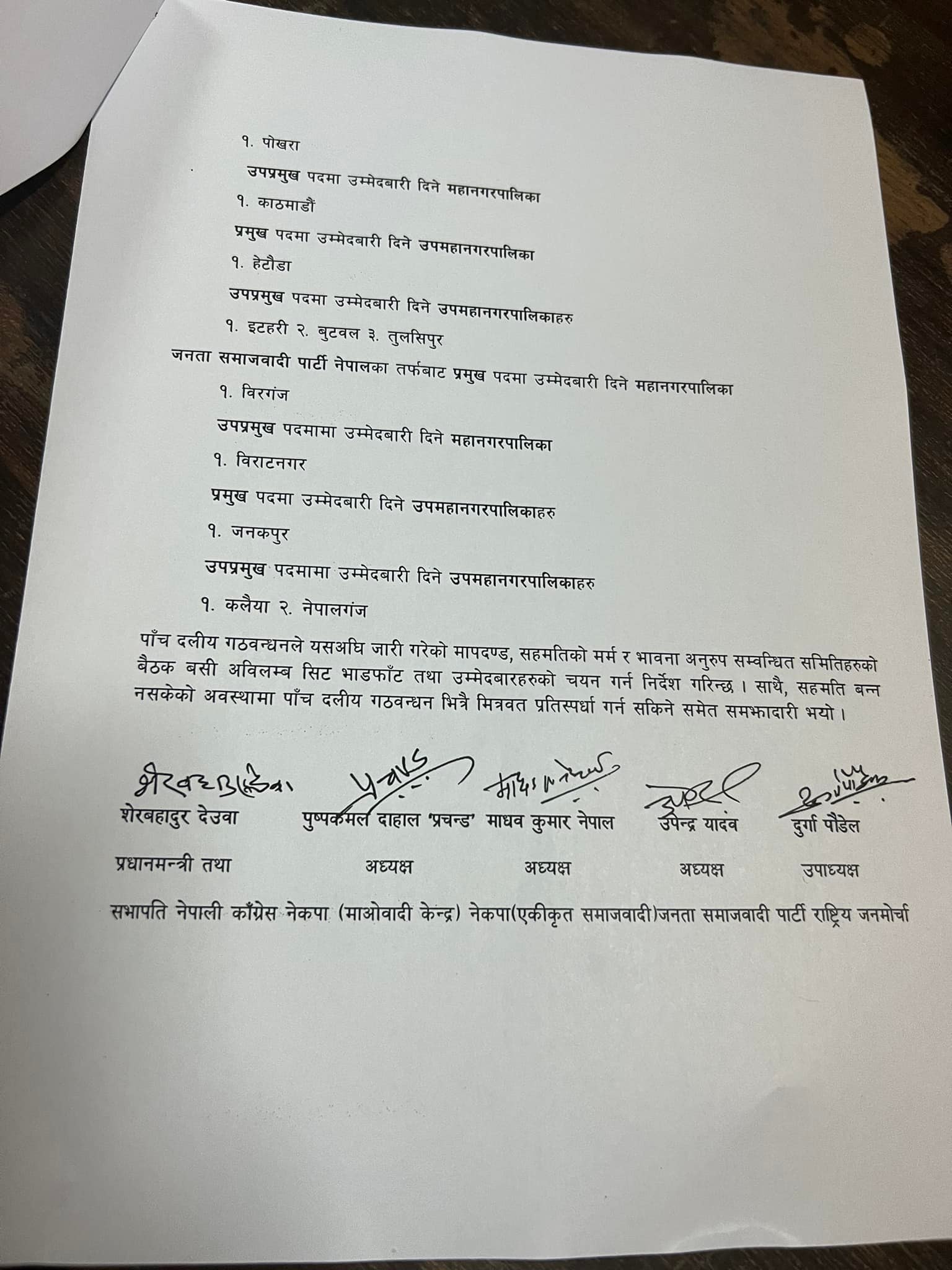 पाँच दलीय गठबन्धनमा ६ महानगर र ११ उपमहानगरपालिकाको भागबण्डाको सहमति भएको छ। लामो रस्साकस्सीपछि गठबन्धनले महानगर र उपमहानगरको भागबण्डा टुंगाएको हो।