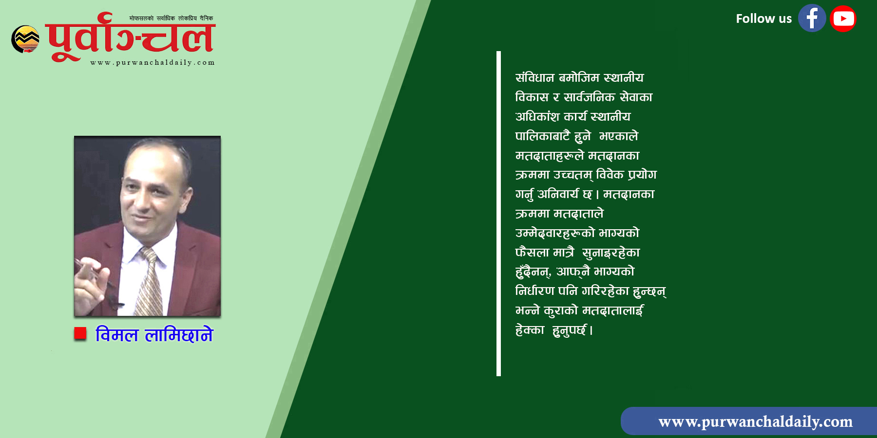 संविधान बमोजिम स्थानीय विकास र सार्वजनिक सेवाका अधिकांश कार्य स्थानीय पालिकाबाटै हुने भएकाले मतदाताहरूले मतदानका क्रममा उच्चतम् विवेक प्रयोग गर्नु अनिवार्य छ । मतदानका क्रममा मतदाताले उम्मेदवारहरूको भाग्यको फैसला मात्रै सुनाइरहेका हुँदैनन्, आफ्नै भाग्यको निर्धारण पनि गरिरहेका हुन्छन् भन्ने कुराको मतदातालाई हेक्का हुनुपर्छ ।