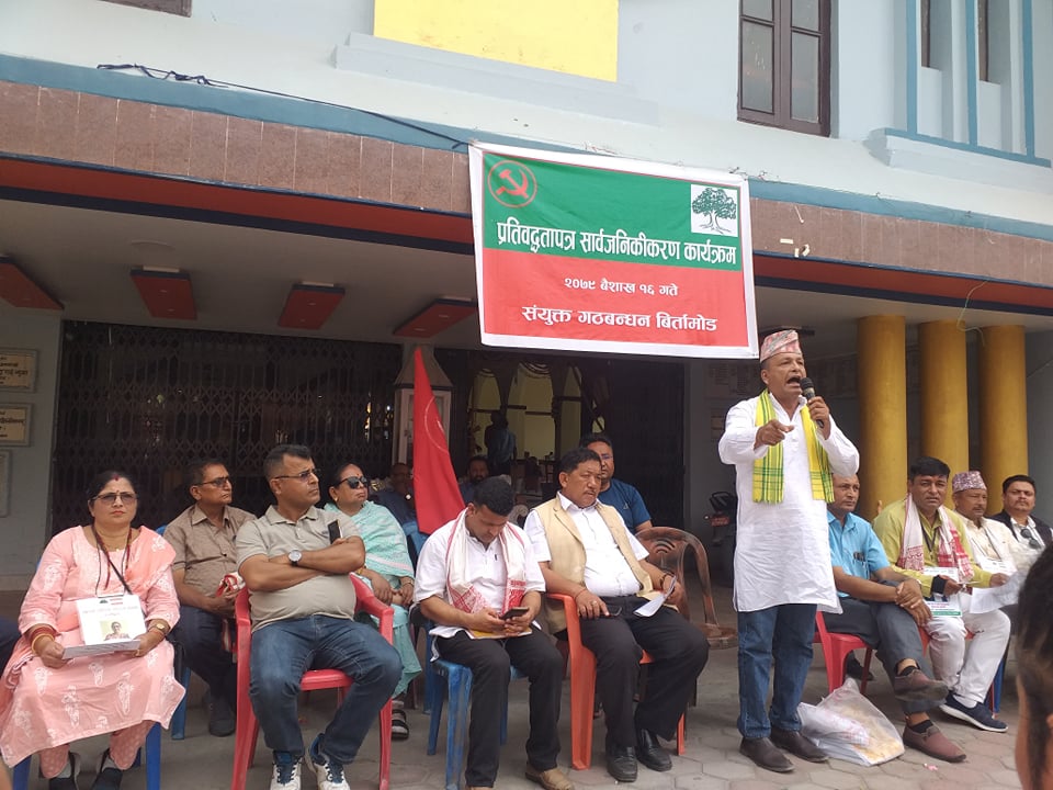 संयुक्त गठबन्धन निर्वाचन परिचालन समितिको आयोजनामा सम्पन्न कार्यक्रममा नेपाली कांग्रेस झापाका सभापति देउकुमार थेवे, विर्तामोडका लागि मेयरका उम्मेद्वार एवं नेपाली कांग्रेसका नगर सभापति भोजराज सिटौला, उपमेयरका उम्मेद्वार एवं नेकपा माओवादी नेता सि.पि. कडरिया, १ नम्बर वडाअध्यक्ष पदका उम्मेद्वार बलराम कार्की लगायतले संयुक्त रुपमा उक्त प्रतिबद्धता पत्र सार्वजनिक गरेका हुन् ।