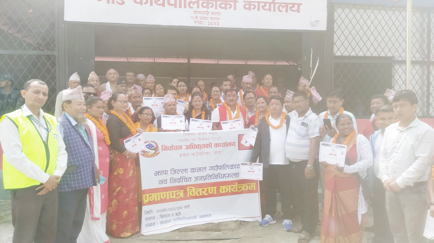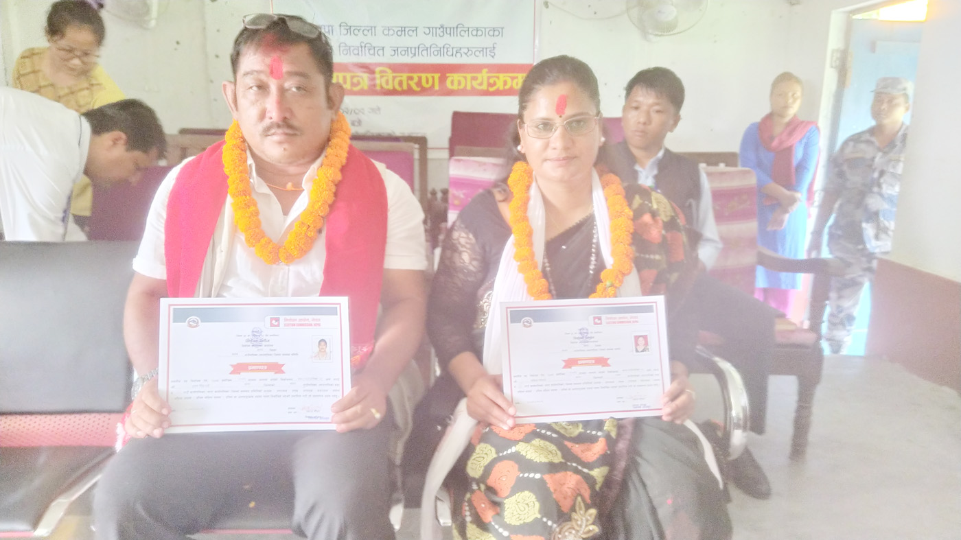 कमल गाउँपालिकाको सभाहलमा सम्पन्न कार्यक्रममा निर्वाचन अधिकृत प्रकास गौतमले गाउँपालिकका अध्यक्ष हुकुम सिंह राई, उपाध्यक्ष प्रमितला गौतमलाई निर्वाचित भएको प्रमाणपत्र प्रदान गनुृभएको थियो ।