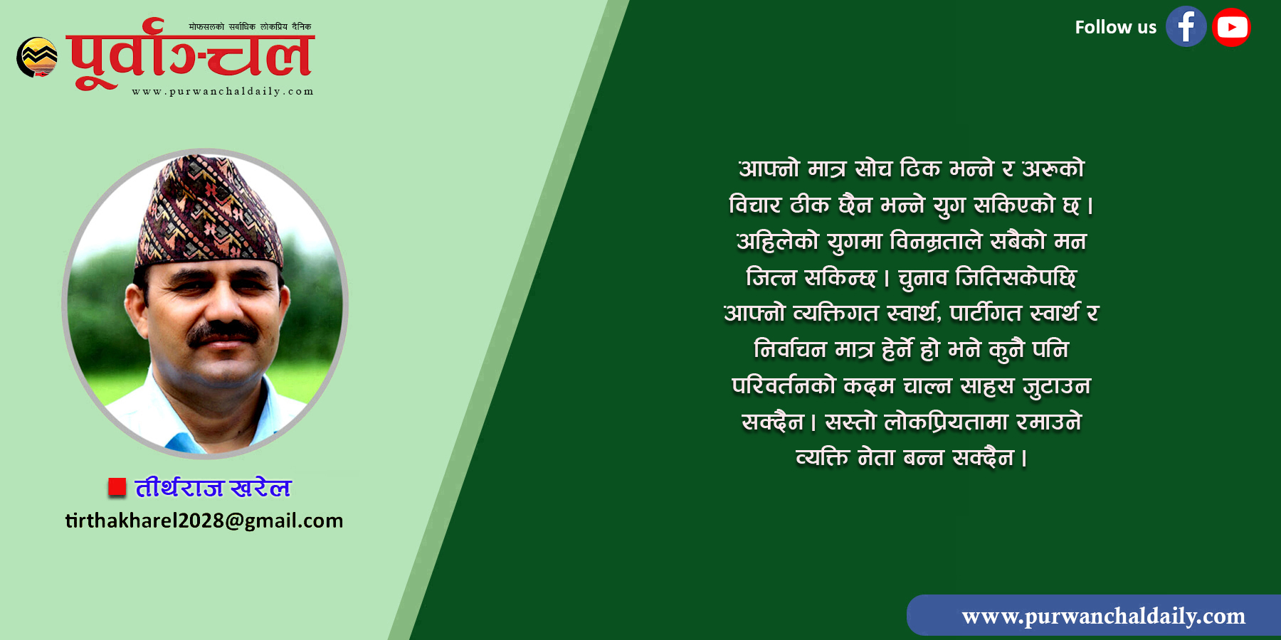 विगतको चुनावमा भारी मतले विजय हासिल गर्नेहरू नराम्ररी हारेका छन् भने सोच्दै नसोचेकाहरू ‘एक जुगमा एकदिन एक चोटी आउँछ, उलटपुलट–उथलपुथल हेरफेर ल्याउँछ’ भने झैं साना भनिएका दलका उम्मेदवार जितिरहेका छन् भने कतिपय प्रमुख स्थानमा स्वतन्त्र उम्मेदवारहरू पनि विजयको माला पहिरिरहेका छन् । नेपाल गत सात दशकदेखि नै संक्रमणकालमै अल्झिरहेको छ । यसबीचमा राजनीतिमा अस्थिरता बाहेक सबै हरायो । इमानदारी, नैतिकता, जवाफदेही भन्ने चीज नै रहेन । प्रत्येक परिवर्तनमा आम नागरिकले नेतृत्ववर्गको साथ दिए, तर नेताहरूले प्रत्येक पटक देश हाँक्ने अवसर पाउँदा समेत नागरिकको हितमा काम गर्न सकेनन् । नेताले अवसरको सदुपयोग गर्न नसकेकै कारण विस्तारै नेतृत्वले आम नागरिकको साथ गुमाउँदै गए । सही समयलाई बुझेर सही नेतृत्वलाई सत्ता हस्तान्तरण गर्न नसक्नु नेताहरूको कमजोरी हो ।