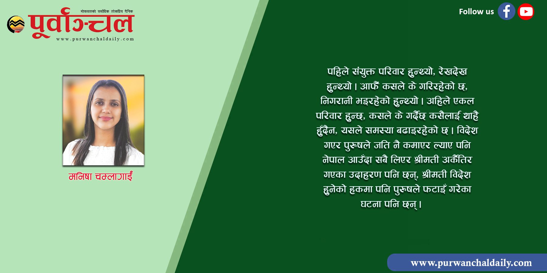 ‘अधिकांश पुरुष वैदेशिक रोजगारीमा गए कमाई हुने साथै पारिवारिक झमेलाबाट समेत टाढा हुन पाउने मनसायले विदेश जान्छन्’ –उनले भने– ‘यसले कति पुरुष विदेशमा नै भुल्छन् त कति महिला श्रीमान् विदेश गएपछि परपुरुषसँग सम्बन्ध राख्न पुग्छन्, जसले परिवारमा विग्रह बढाउँदै लगेको छ ।’