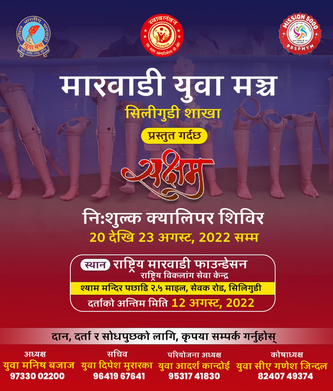 भारतस्थित सिलिगुडी शाखाको आयोजनामा नेपाल तथा भारतका नागरिकलाई लक्षित गर्दै कृतिम खुट्टा बितरणको तायारी शुरु गरेको मारवाडी युवा मञ्च बिर्तामोडमा पूर्व महासचिव प्रविण अग्रवालले जानकारी दिए ।