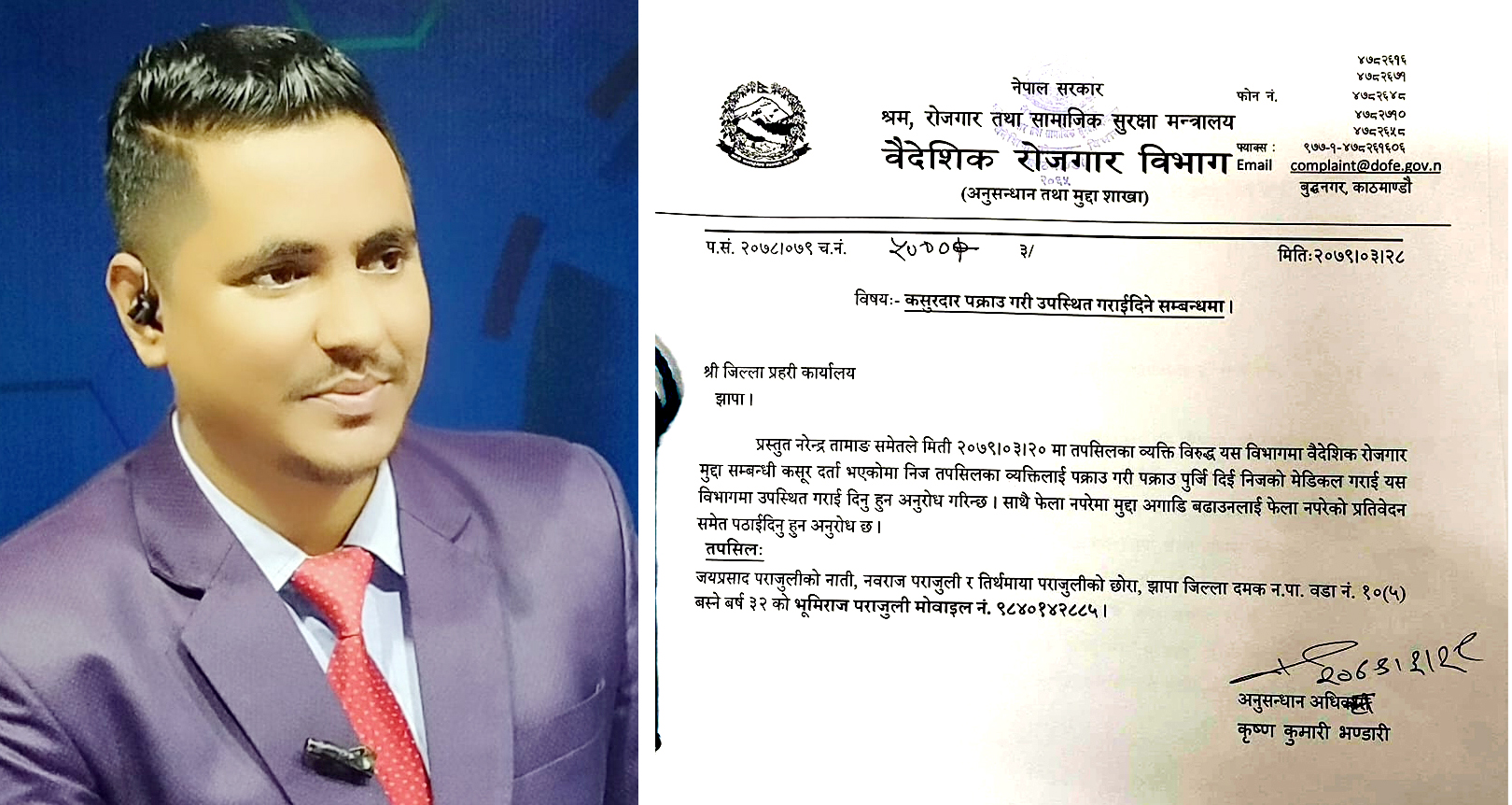 दमकस्थित हिमशिखर टेलिभिजनको समाचार प्रमुखका रुपमा कार्यरत पत्रकार पराजुलीबिरुद्ध वैदेशिक रोजगार कसुर मुद्दामा पक्राउ पूर्जी जारी गर्दै उनलाई पक्राउ गर्न जिल्ला प्रहरी कार्यालय झापालाई वैदेशिक रोजगार विभागले आग्रह गरेसँगै यस्तो रहस्य खुलेको हो ।