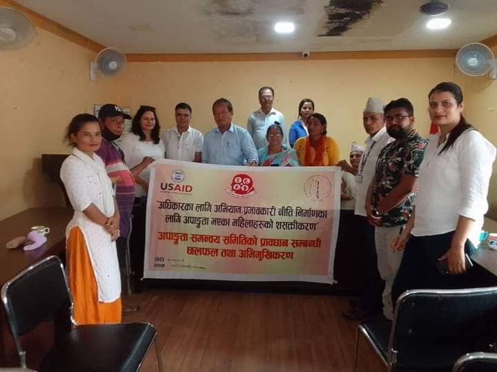 संघकी जिल्ला अध्यक्ष मीना आचार्यले अधिकारका लागि अभियान, प्रभावकारी नीति निर्माणका लागि अपाङ्गता भएकाहरूको सशक्तीकरणका लागि पालिकाको भूमिका महत्वपूर्ण रहने जनाउनुभयो । नवनिर्वाचित जनप्रतिनिधिहरुको कार्यकालसङ्गै नयाँ समन्वय समिति गठन सम्बन्धी प्रावधानका बारेमा पनि छलफल भएको थियो ।