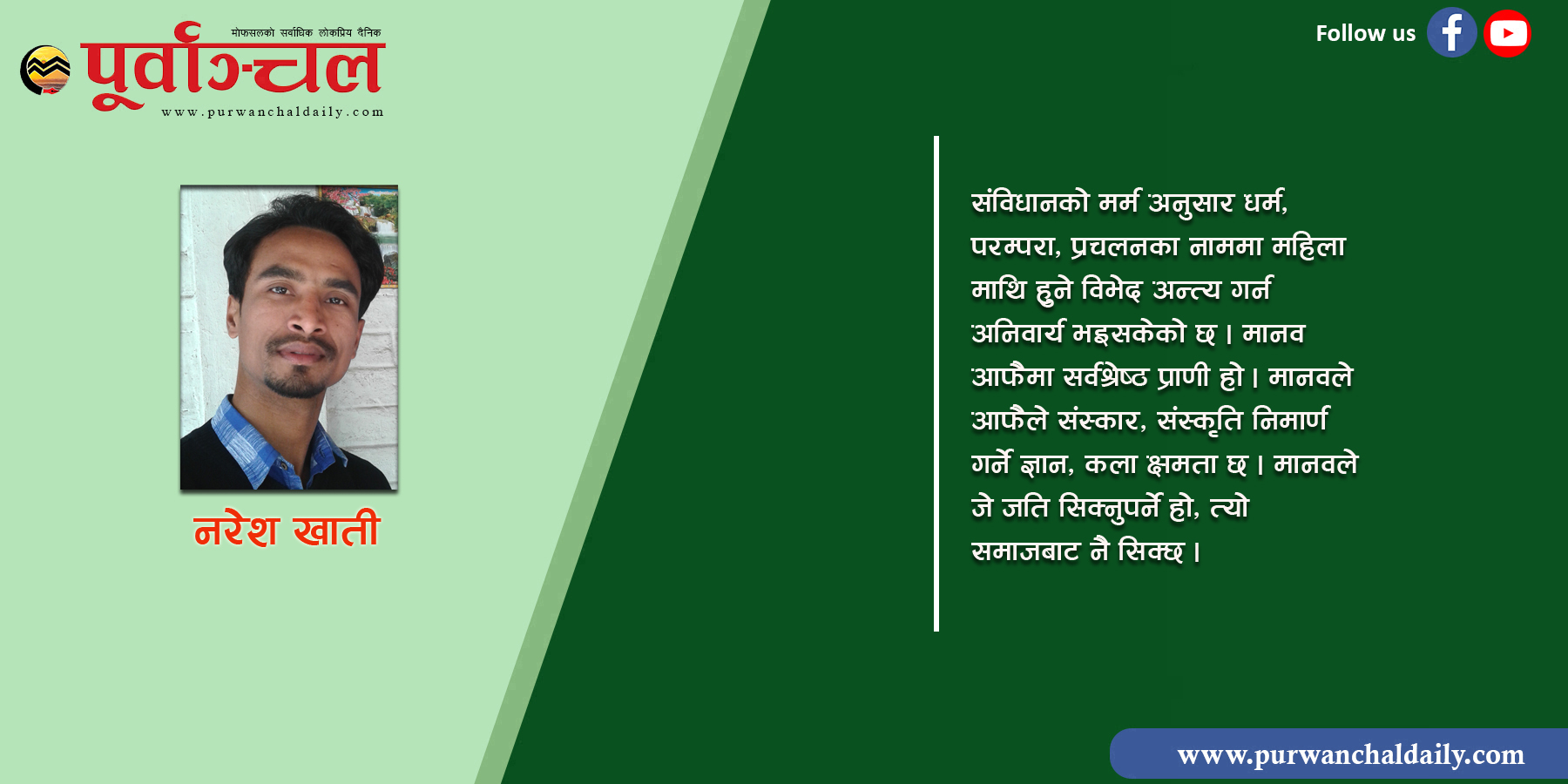 संविधानको मर्म अनुसार धर्म, परम्परा, प्रचलनका नाममा महिला माथि हुने विभेद अन्त्य गर्न अनिवार्य भइसकेको छ । मानव आफैमा सर्वश्रेष्ठ प्राणी हो । मानवले आफैले संस्कार, संस्कृति निमार्ण गर्ने ज्ञान, कला क्षमता छ । मानवले जे जति सिक्नुपर्ने हो, त्यो समाजबाट नै सिक्छ । यस विषयमा प्राचीन मानवमा भन्दा वर्तमान मानवमा कयौं गुणा सचेतना छ । समाजशास्त्रीहरुका अनुसार मानव समाज र संस्कृति दुबै मानव कै उपज हुन । जैविक प्राणीलाई मानवीय प्राणीमा रुपान्तरण गर्ने काम संस्कृतिले गर्दछ । तर, संस्कृतिलाई जन्म दिने काम मानवले नै गर्ने हो । यदि मानवले संस्कार र संस्कृतिलाई समयसापेक्ष परिवर्तन नगर्ने हो भने ऊ केवल जैविक प्राणीको रुपमा मात्र रहन्छ ।