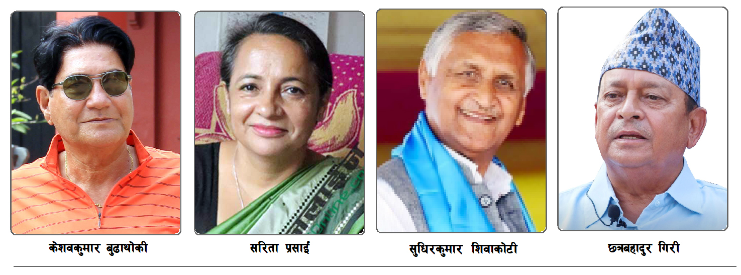 बुढाथोकी यस अघि झापा क्षेत्र नम्वर ४ बाट प्रतिनिधि सभामा निर्बाचित हुँदै सामान्य प्रशासनमन्त्री बनेका थिए । प्रसाई यस अघि कृषि राज्यमन्त्री थिइन् भने शिवाकोटी संविधान सभा सदस्य थिए । गुरुङ बिर्तामोड नगरपालिकाको अघिल्लो स्थानीय निर्वाचनमा नगर प्रमख पदका लागि प्रतिष्पर्धी थिए । यता गिरी बन्धु टी इस्टेटका सञ्चालक गिरी भने २०४२मा नेपाली कांग्रसको जिल्ला सदस्य हुँदै राजनीतिमा सक्रिय छन् ।