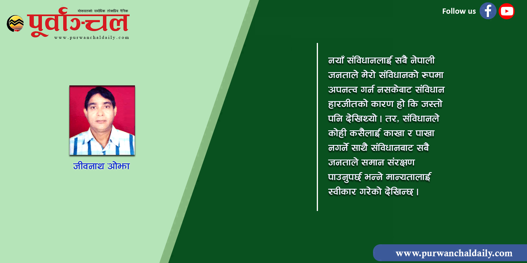 देश र जनताको समृद्धिको लागि निकै लामो प्रक्रिया पूरा गरेर कठिनतापूवर्क जारी हुन सकेको नेपालको संविधानमा आवश्यक सहमति गरी सफल र गुणात्मक कार्यान्वयनमा जाँदै गरेको देखिएको छ । यसका लागि सबैको सकारात्मक सोचर प्रभावकारी भूमिका अनिवार्य देखिन्छ ।
