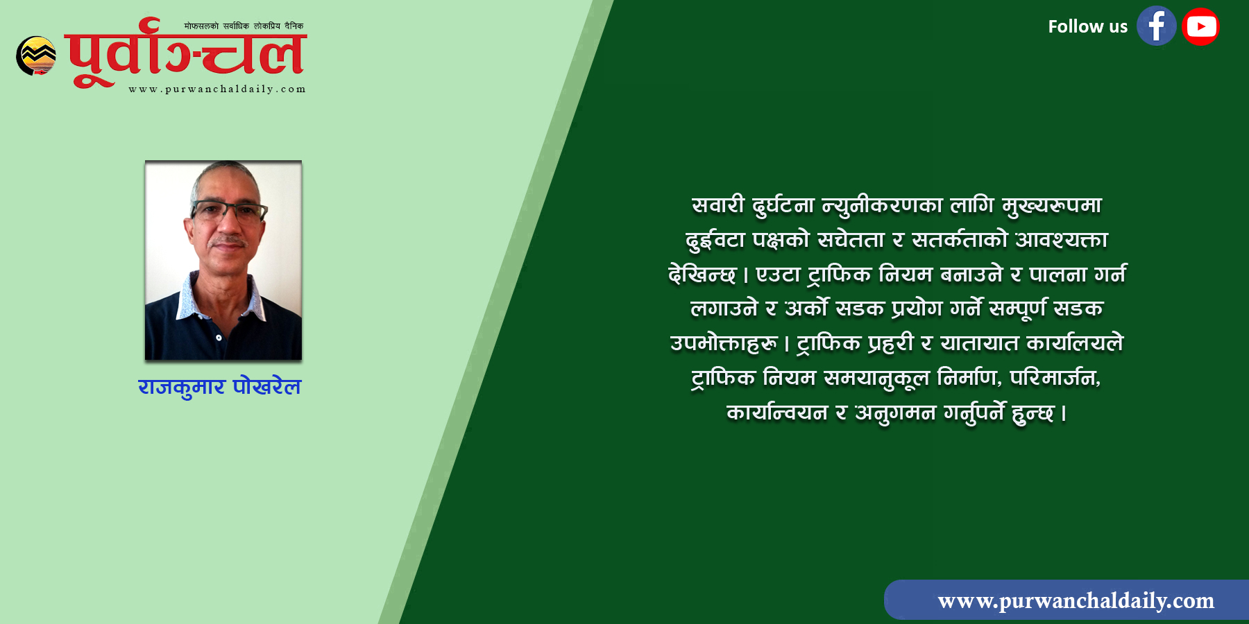 हामी कहाँ ट्राफिक नियम केबल ठूला सवारी चालकले मात्र पालना गर्नुपर्ने भन्ने भ्रम छ । पैदलयात्री, साइकल, ठेला, ई–रिक्सा, अटो रिक्सा, मोटरसाइकल, स्कुटी चालकहरु देखि सडक उपभोग गर्ने सबैले ट्राफिक नियमको पालना कमै गरेको पाइन्छ । अहिले त ठूलोलाई मात्र दोष देख्ने अघोषित कानून छ । ठूलो सानो, निजी वा भाडाको, साइकल चालक केही नभनी अपराध अनुसार दण्ड–सजाय दिने गर्नुपर्ने हुन्छ । सबैलाई अनुशासनको दायरामा ल्याउन जरुरी हुन्छ । अटेर गर्नेलाई पैसाको जरिवाना मात्र पर्याप्त हुँदैन । लाइसेन्स केही समयको लागि ससपेन्डदेखि रद्दसम्म गर्न तयार हुनुपर्छ । छोटो समयको लागि जेल सजाय पनि दिनुपर्छ ।