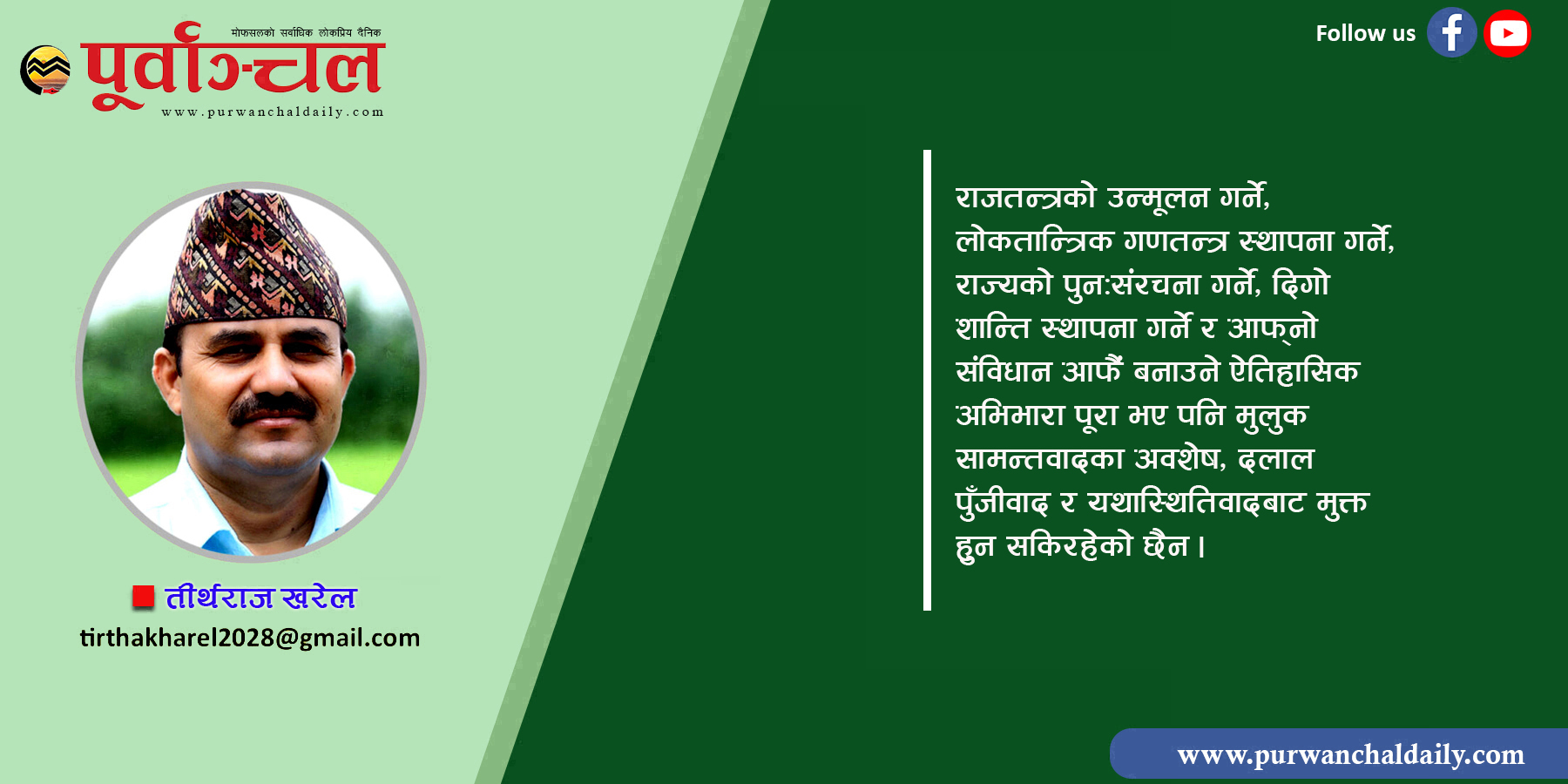 यथार्थमा राजनीतिक क्रान्ति पनि पूरा भएको छैन, आर्थिक क्रान्ति पनि पुरा भएको छैन र सामाजिक–सांस्कृतिक क्रान्ति पनि जारी छ मुलुकमा । सीमित राजनीतिक स्वतन्त्रतालाई नै लोकतन्त्र ठान्ने तथा दुःखजिलो गरेर पनि, रगत–पसिना बगाएर पनि भोकै मर्नुपर्ने गरिबको पक्षमा नभएको व्यवस्थालाई नै पूर्ण राजनीतिक स्वतन्त्रता भएको ठान्ने सिद्धान्तका रूपमा स्वीकार गर्ने शक्तिहरू सारमा जनविरोधी नै हुन् । तसर्थ, जनताले लोकतान्त्रिक गणतन्त्र तथा सामाजिक न्यायसहितको लोकतन्त्रको पक्षमा दृढतापूर्वक उभिने दल र उम्मेदवार चुन्न जरुरी छ । पाँच–पाँच वर्षमा आउने चाड जस्तो पारम्परिक अवसर होइन चुनाव, शान्तिपूर्णकालमा जनताको अत्यन्तै बलवान हतियार हो चुनाव र यतिबेला पार्टीहरूका विगत र उनीहरूले अवलम्बन गरेका अभ्यास र लिएका नीति तथा विचारहरूलाई सही ढंगले बुझेर अघि बढ्न आवश्यक छ ।
