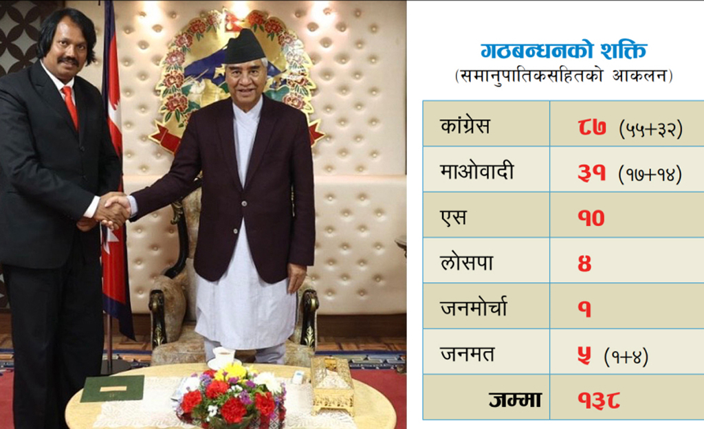 सत्ता गठबन्धनको नेतृत्व गरेको कांग्रेसले हालसम्म प्रत्यक्षतर्फ ५५ सिट जितेको छ भने समानुपातिकतर्फ ३२ सिट पाउने देखिन्छ । योसहित कांग्रेसको कुल सिट ८७ हुन्छ । प्रत्यक्षमा १७ सिट जितेको माओवादीको समानुपातिकमा १४ गरी कुल ३१ सिट पुग्छ । एकीकृत समाजवादीले बिहीबार मध्यरातसम्म समानुपातिकतर्फ ३ प्रतिशत कटाउन सकेको छैन । उसको प्रत्यक्षतर्फ १० सिट छ । लोसपाको ४ र राष्ट्रिय जनमोर्चाको १ सिट छ । यी समेत गर्दा सत्ता गठबन्धनको पक्षमा १ सय ३३ सिट आउने देखिन्छ । जनमत पार्टीको थप ५ सिट जोडिँदा सत्ता गठबन्धनलाई सरकार बनाउन आवश्यक २ सय ७५ को बहुमत १ सय ३८ सिट ठ्याक्कै पुग्छ । गणना जारी रहेका ३ क्षेत्रमा गठबन्धनले नै जित्ने आकलन कांग्रेस–माओवादीको छ ।