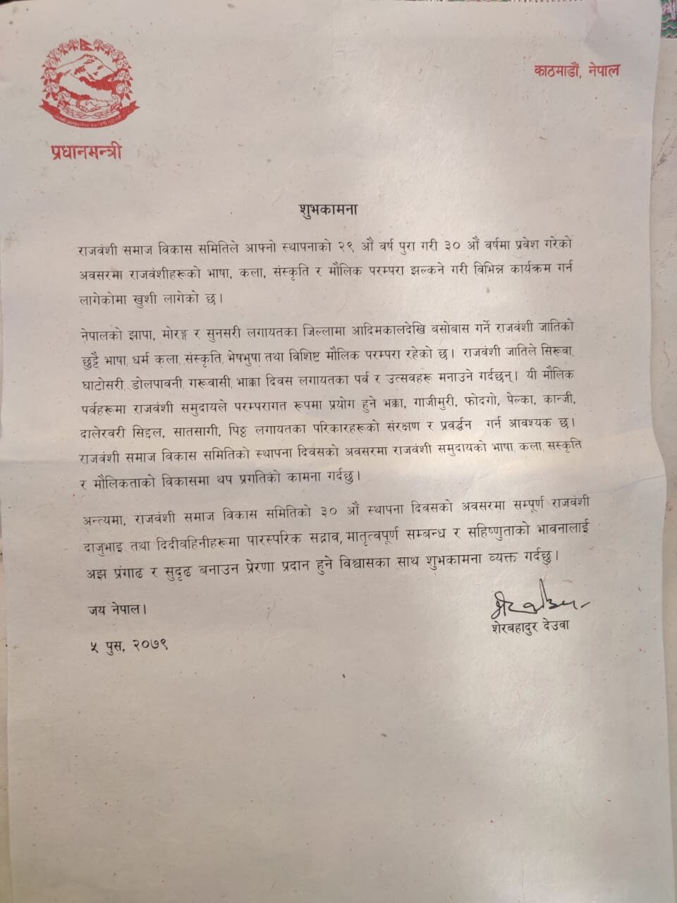 प्रधानमन्त्री देउवाले मंगलबार एक लिखित सन्देश जारी गर्दै राजवंशी समाज विकास समितिको २९ औं स्थापना दिवस अवसरमा शुभकामना सन्देश जारी गरेका हुन् । प्रधानमन्त्री देउवाले राजवंशी समाज विकास समिति २९ औं वर्ष पूरा गरी ३० औं वर्षमा प्रवेश गरेको अवसरमा राजवंशीहरुको भाषा, कला, संस्कृति र मौलिक परम्परा झल्कने गरी विभिन्न कार्यक्रम आयोजना गरेकोमा खुशी समेत व्यक्त गरेका छन् ।