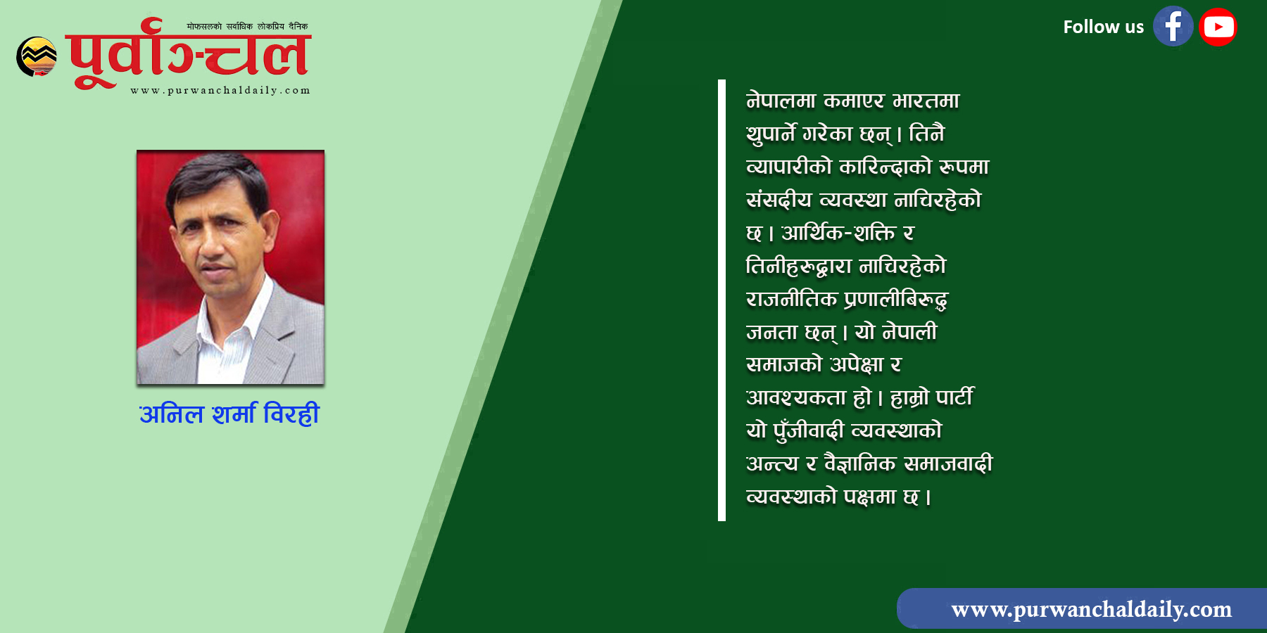 राजतन्त्र ढल्यो आज पुरानै संसदवादी दल सत्तारुढ दलको रहेको छ । नेपाली नागरिकता लिएका मारवाडी नामका भारतीयहरुको हातमा अर्थतन्त्र कैद भएको छ । नेपालमा कमाएर भारतमा थुपार्ने गरेका छन् । तिनै व्यापारीको कारिन्दाको रुपमा संसदीय व्यवस्था नाचिरहेको छ । आर्थिक–शक्ति र तिनीहरुद्वारा नाचिरहेको राजनीतिक प्रणालीबिरुद्ध जनता छन् । यो नेपाली समाजको अपेक्षा र आवश्यकता हो । हाम्रो पार्टी यो पुँजीवादी व्यवस्थाको अन्त्य र वैज्ञानिक समाजवादी व्यवस्थाको पक्षमा छ । त्यसैले हाम्रो विकास निश्चित छ भन्ने हामी ठान्छौं ।