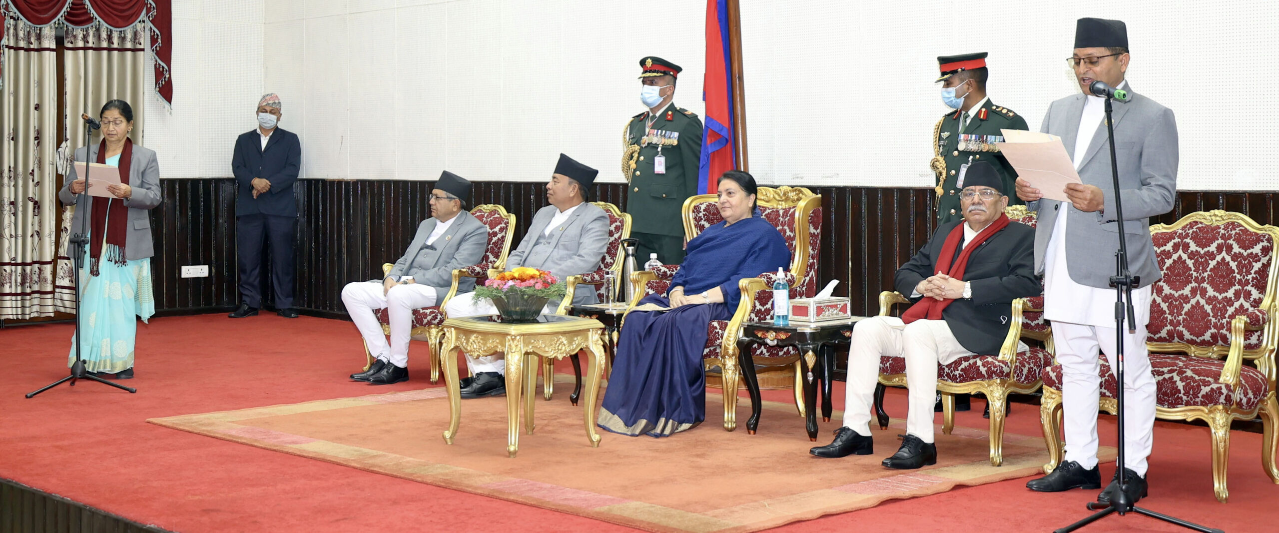 राष्ट्रपति विद्यादेवी भण्डारीको उपस्थितिमा राष्ट्रपति कार्यालय शीतलनिवासमा मङगलबार आयोजित समारोहमा राष्ट्रियसभाका अध्यक्ष गणेशप्रसाद तिमिल्सिना राष्ट्रियसभाका नवनिर्वाचित उपाध्यक्ष उर्मिला अर्याललाई पद तथा गोपनीयताको शपथ गराउँदै । समारोहमा उपराष्ट्रपति नन्दबहादुर पुन, प्रधानमन्त्री पुष्पकमल दाहाल …प्रचण्ड’ प्रतिनिधिसभाका सभामुख देवराज घिमिरे सहभागी हुनुुहुन्थ्यो । तस्बिरः तस्बिरः प्रदीपराज वन्त/रासस